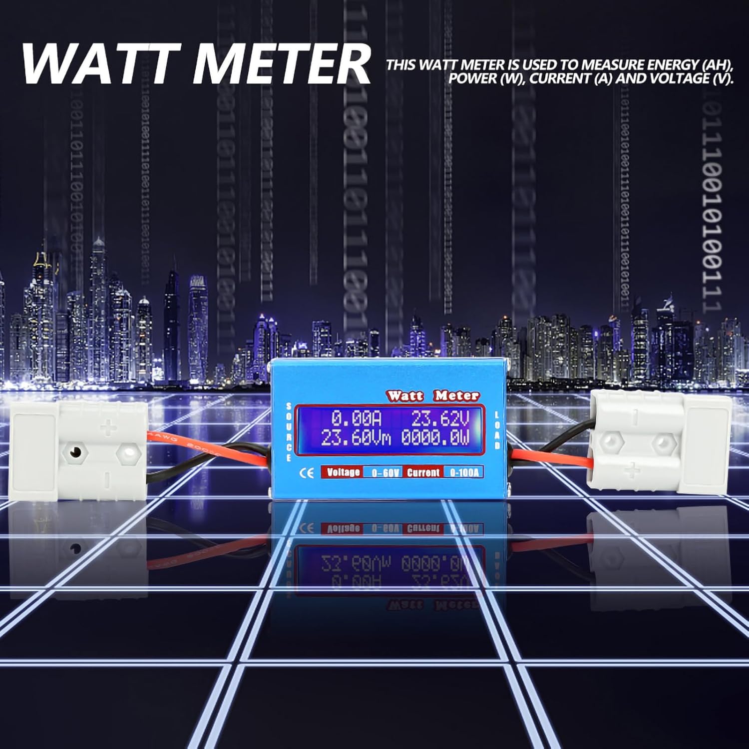 Este vatímetro se utiliza para medir energía (AH), potencia (W), corriente (A) y voltaje (V).