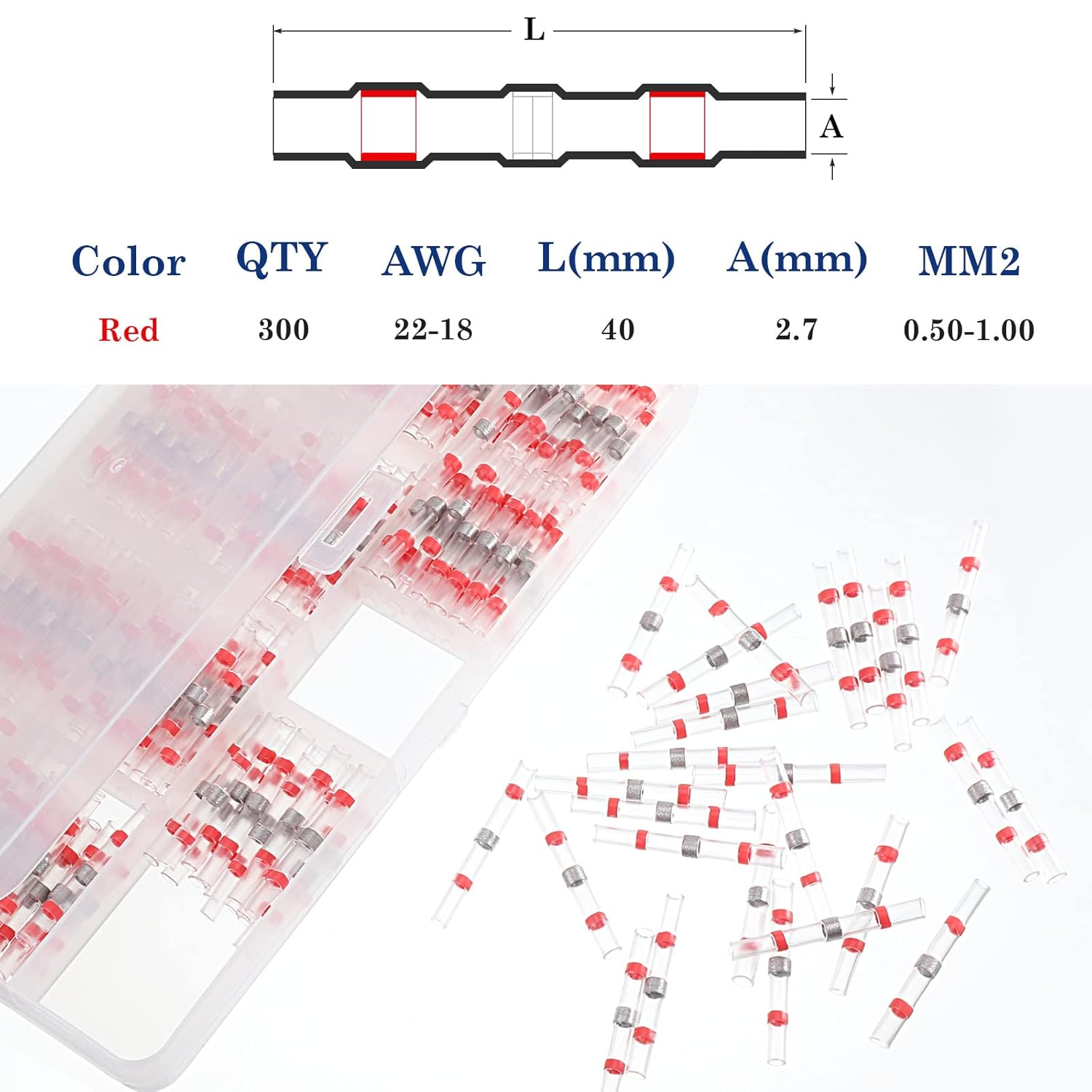El paquete incluye: recibirás 300 unidades de conectores de soldadura rojos (AWG: 22-18, 0,5 – 1,0 mm²), conector retráctil impermeable rojo de 0,5 – 1,0 mm, empaquetado en una caja de plástico reutilizable. Fácil de llevar. Para satisfacer sus diferentes necesidades para completar varios proyectos.