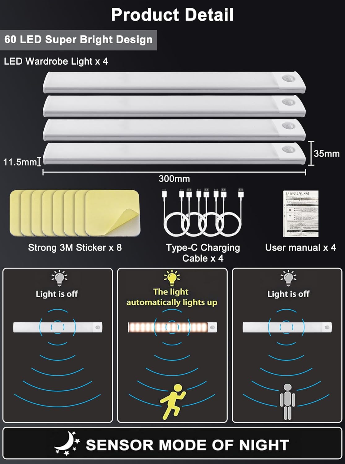 【4 luces LED con sensor de movimiento】Incluye 4 luces LED para gabinete (30 cm, 60 LED, 500 mAh), 4 cables de carga tipo C y 8 pegatinas magnéticas, el sensor de movimiento incorporado puede detectar automáticamente el movimiento dentro de un rango de 3- 5 metros y un ángulo de iluminación de 120°, se enciende cuando alguien está dentro del alcance y se apaga después de 25 segundos si no se detecta movimiento.
