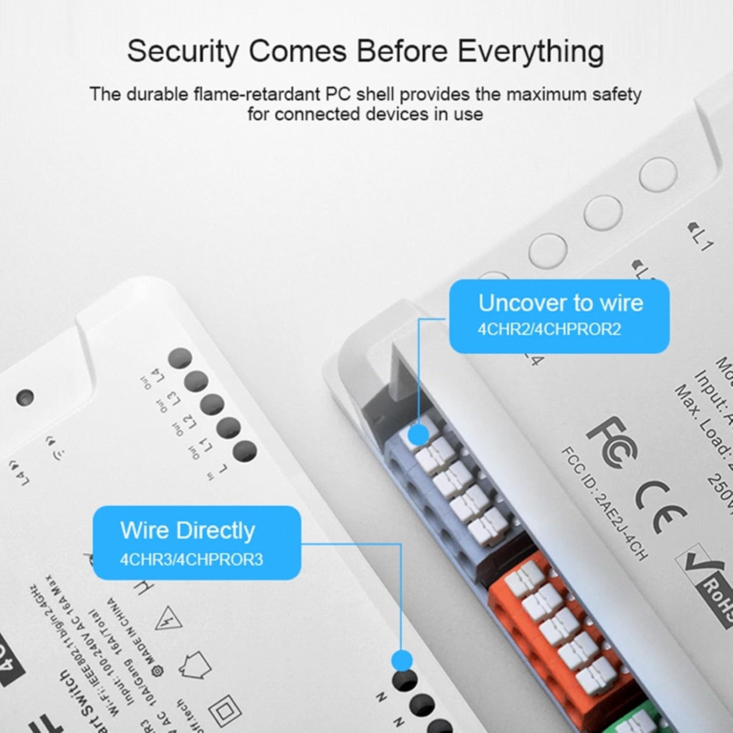 Management remoto en cualquier lugar: enciende y apaga fácilmente 4 dispositivos eléctricos desde cualquier lugar utilizando la aplicación «for eWeLink». Soporta management remoto RF de 433 MHz para mayor comodidad.