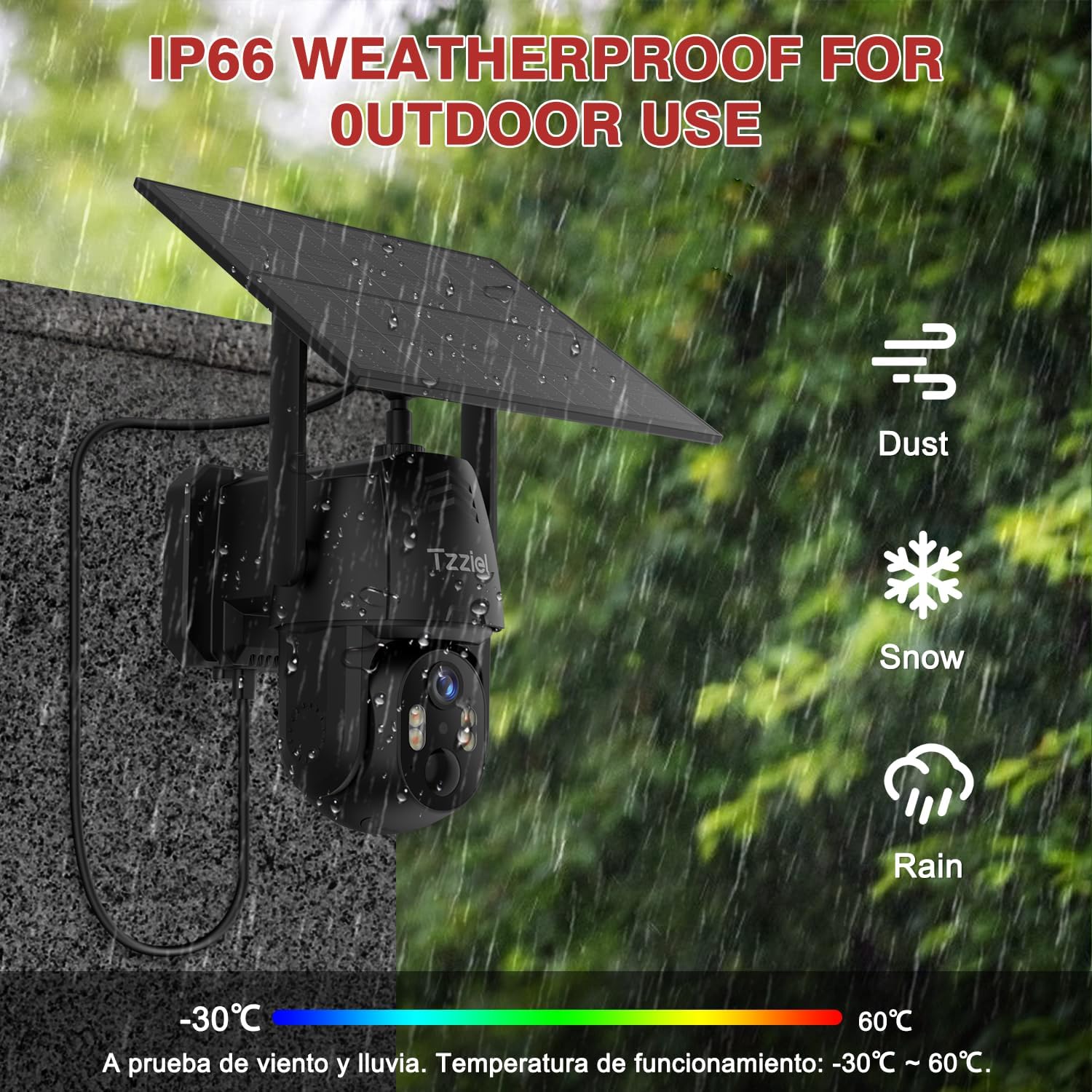 【Resistencia IP66 y soporte técnico rápido para tu cámara de vigilancia exterior】 La cámara de vigilancia exterior cuenta con una carcasa de clase IP66, lo que la hace resistente a lluvia, nieve y temperaturas extremas (-20°C~50°C), funcionando de forma estable en condiciones climáticas adversas. Si tiene algún problema de uso u otro tipo de inconveniente, puede contactar con el soporte técnico en línea a través de la aplicación.