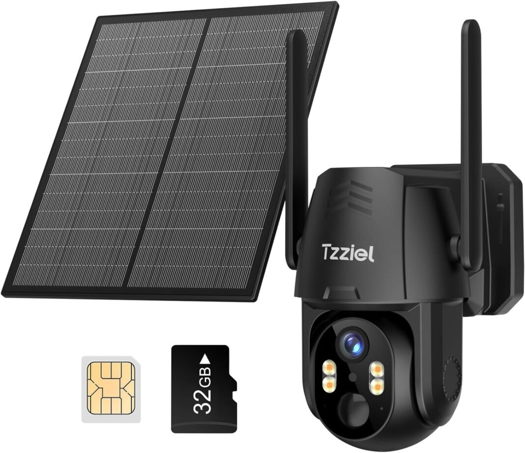 Tzziel Cámara de vigilancia photo voltaic exterior 4G LTE con panel photo voltaic de 6W y batería integrada de 10400mAh, incluye tarjeta SIM preinstalada y tarjeta SD de 32GB. Rotación de 360°, visión nocturna en blanco y negro, resistencia al agua. Muy adecuado para uso exterior.