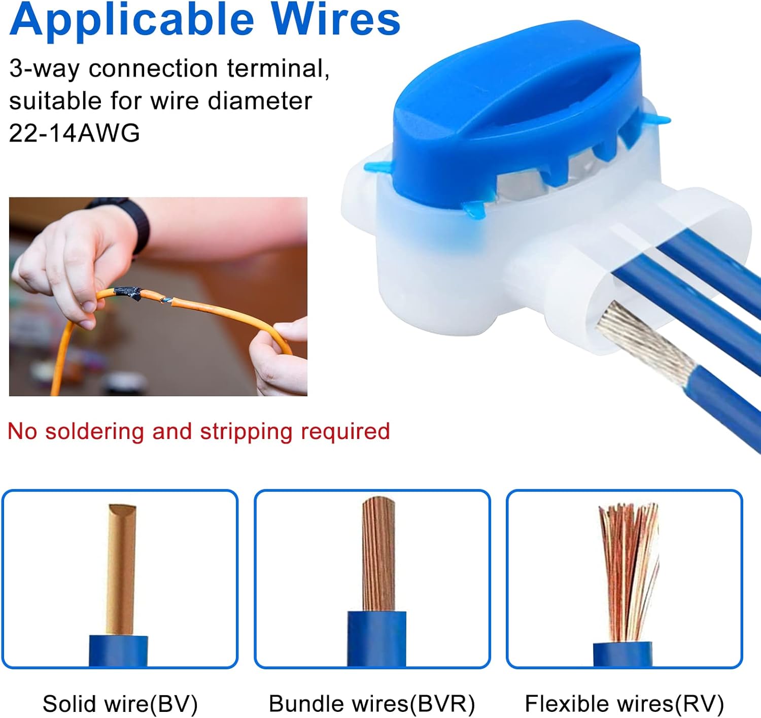Fácil y seguro: los conectores de cable son fáciles y seguros de usar sin necesidad de soldar o pelar. Los conectores de cable tienen 3 orificios y admiten conexiones de 2 o 3 líneas. Inserte los terminales de conexión en el extremo del conector del cable hasta que se detenga y presione la parte azul hacia abajo con unos alicates para conectar los cables de forma segura y firme.