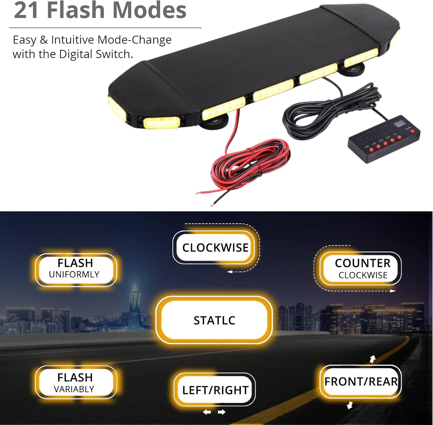 【Barra de Luces de 21 Modos】 Esta luz de advertencia ahora tiene LED súper brillantes de 3 vatios que ofrecen el doble de luz que el LAP Eclipse: SUPER BRILLANTE en días de niebla o días de lluvia. Un whole de 21 modos de flash para elegir.