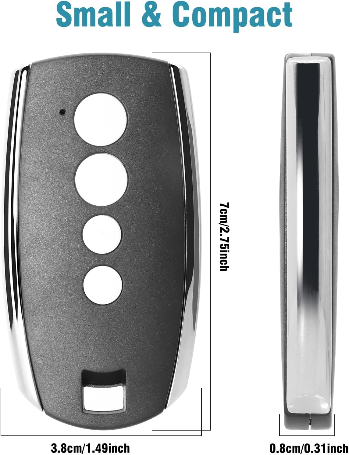 Frecuencia: 433,92 MHz. Botones del mando a distancia: 4Tipo de batería: CR2032 (incorporado). Distancia de transmisión: 50-150 metros (espacio abierto). Tipo de programación: Clonación del código de management remoto unique