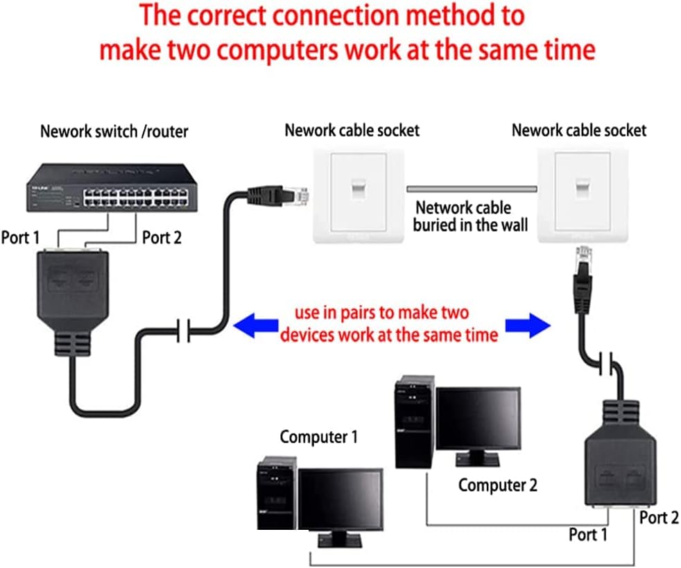 Compatibilidad: este divisor Ethernet RJ45 de 1 a 2 te ayuda a evitar tirar de los cables hacia adelante y hacia atrás y evitar roturas de cables. Puede ser appropriate con ADSL, hubs, interruptores, TV, decodificadores, router, dispositivos inalámbricos, computadora, adecuado para Cat5, Cat5e, Cat6, Cat7.