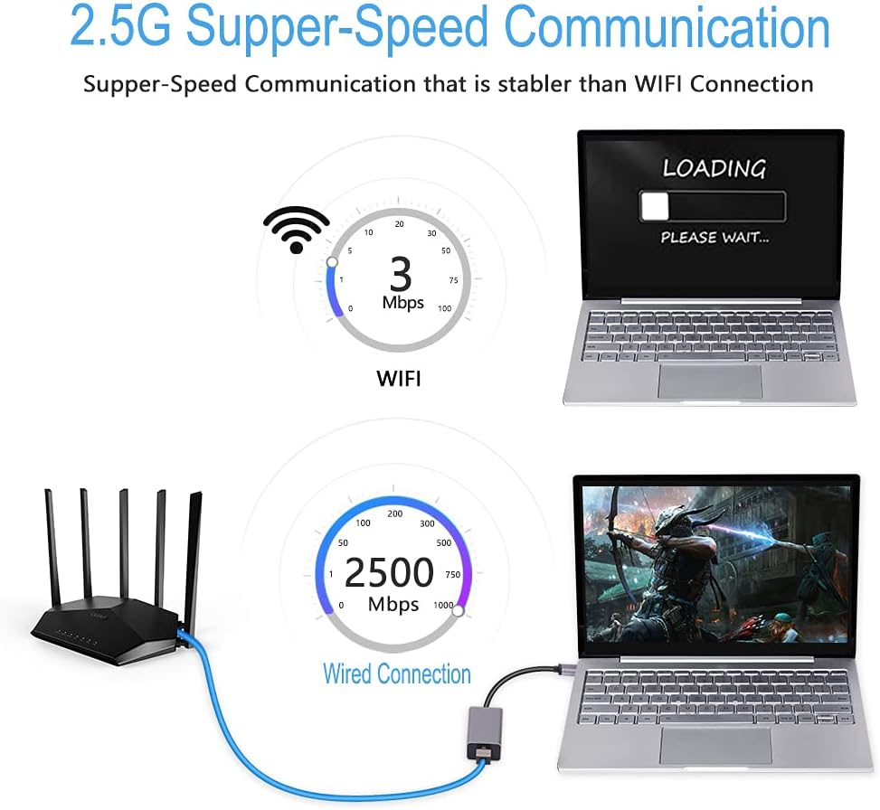 Actualice su puerto Ethernet existente: USB 3.0 a 2. El adaptador Ethernet de 5 Gbps es una solución fácil de usar para actualizar rápidamente su puerto LAN RJ-45 precise a 2, 5 Gbps. ★ Cumple con los requisitos para obtener Ethernet de 2,5 G: 1), descargue los controladores del sitio oficial de Realtek (chip: RTL8156B); 2), compruebe si su tarjeta de pink y su enrutador admiten Ethernet 2,5G o no; 3), asegúrese de conectar el cable LAN Cat 6 o superior al enrutador.