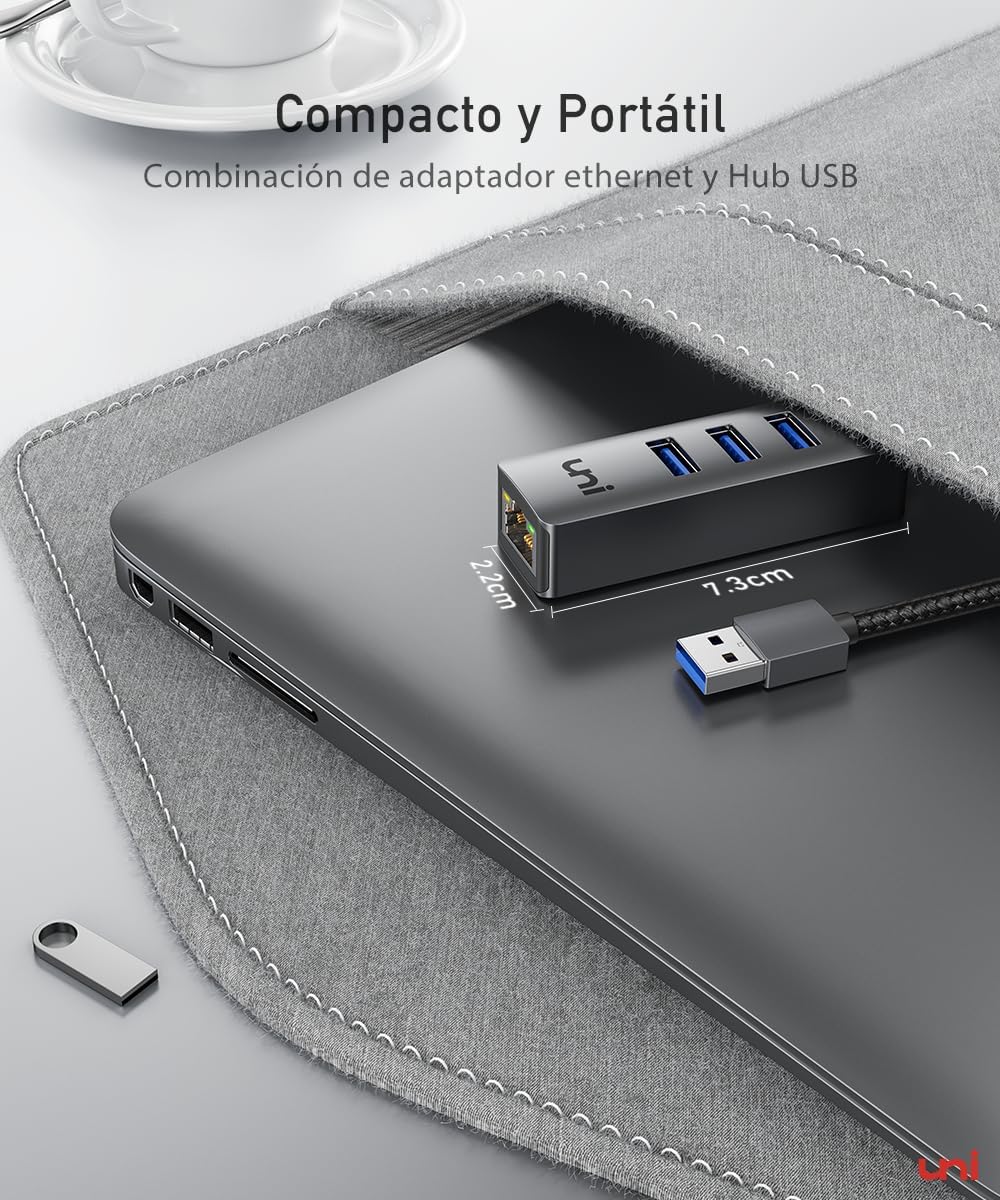 (Velocidad rápida de hasta 5 Gbps) El Adaptador Ethernet USB uni tiene 3 puertos USB 3.0 con velocidades de hasta 5 Gbps. Transfiera archivos en segundos. También inserte fácilmente periféricos USB-A como una unidad flash USB, ratón, teclado, adaptador OTG de teléfono móvil, impresora. Trabaje simultáneamente sin presiones