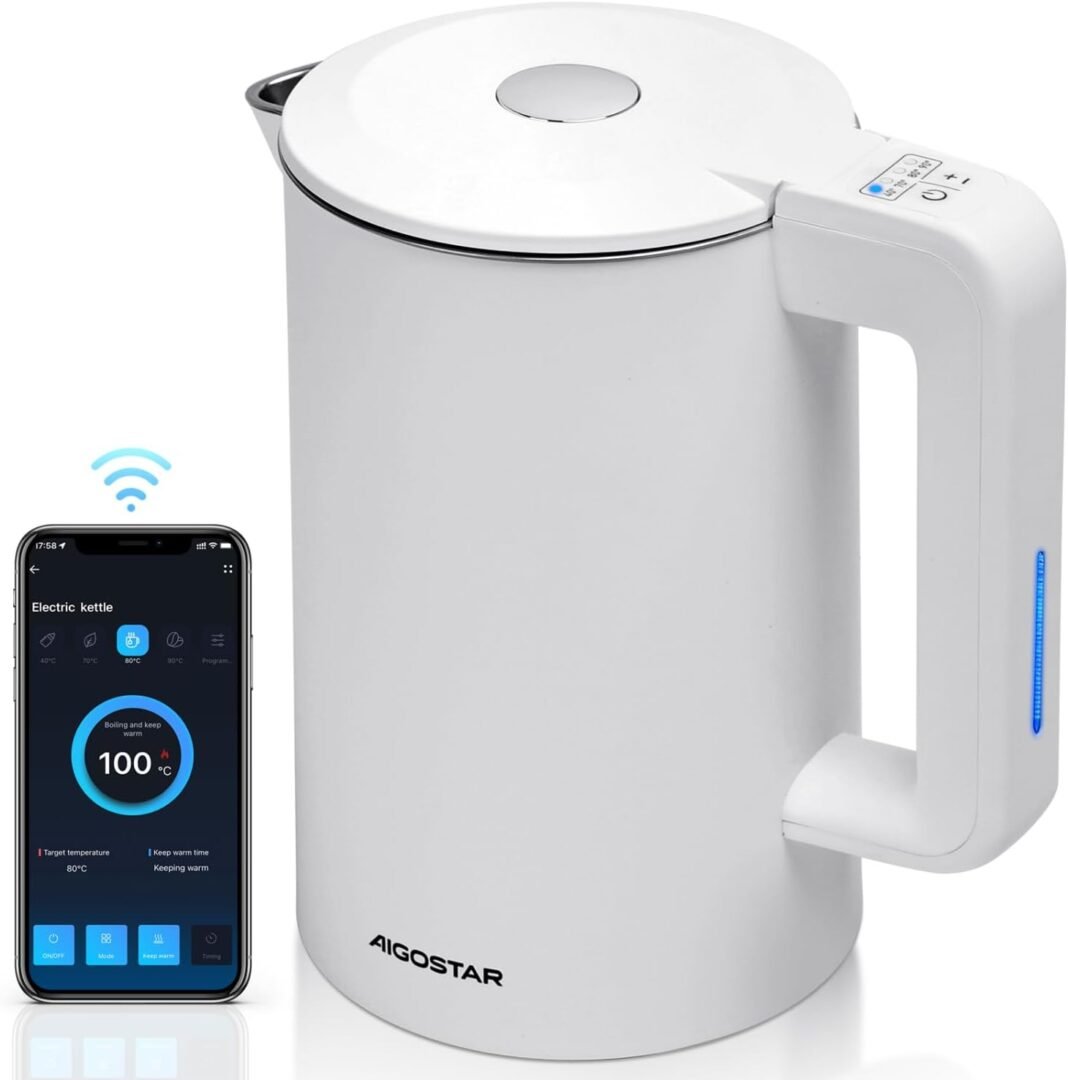 Aigostar – Inteligente Hervidor de Agua Temperatura Regulable de 40 ° C A 100 ° C, Conexión Wi -Fi, Alexa y Google Dwelling. Doble Pared de Acero inoxidable, 2200W, 1,7L, Mantener Caliente 24 Hora, Blanco