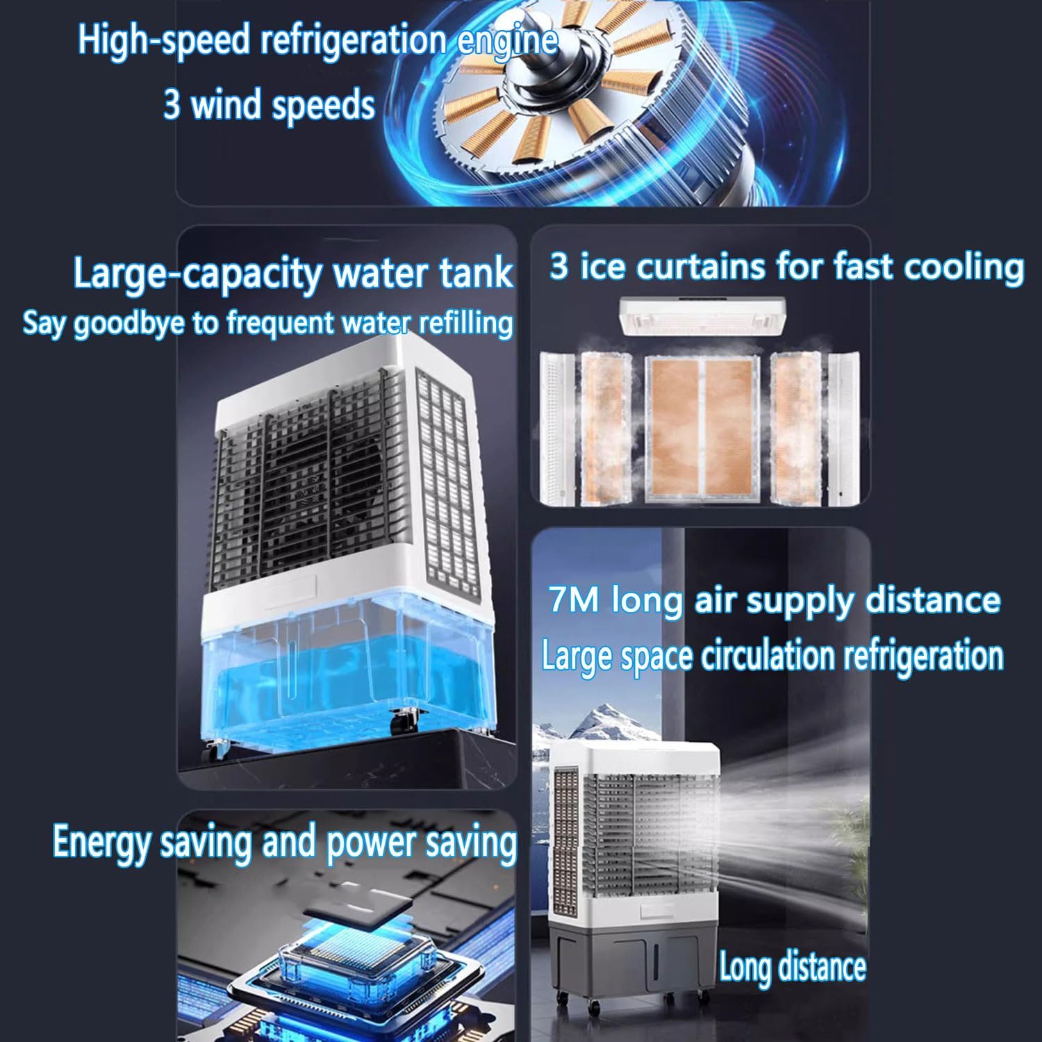 Enfriamiento rápido: la tecnología de evaporación convierte el aire caliente en una brisa fresca para un enfriamiento eficiente. El aire acondicionado está equipado con un tanque de agua de gran capacidad, por lo que no es necesario agregar agua con frecuencia.