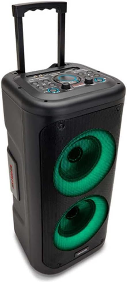 Altavoz de carro. Salida de audio de alta potencia: 40 W RMS / 350 W PMPO Controladores HyperBass duales de 6,5″ para una acústica excelente. Tweeter de aleación de steel para audio de alta frecuencia. Respuesta de frecuencia: 90 Hz-20 KHz, S/N >80 dB. Receptor de audio Bluetooth 5.0 con función TWS incorporada. Alcance inalámbrico: puerto USB mínimo de 10 metros (30 pies) y ranura Micro-SD (tarjeta TF) para reproducción de música MP3. Entrada auxiliar con conector estéreo de 3,5 mm para conexión de dispositivos externos. Conector de entrada de micrófono de 6,3 mm chapado en oro Independientemente del volumen de las otras fuentes de sonido. Sistema de iluminación LED con management seleccionable por el usuario. Iluminación ambiental roja (en ambos lados). Asa plegable y ruedas metálicas para facilitar su transporte. Mando a distancia inalámbrico incluido. Batería de litio recargable: 7,4 V, 3600 mAh (tiempo de carga de 3,5 horas). Toma de corriente = DC 10 V1 A (para cargar la batería). Cable auxiliar de nailon trenzado de m de longitud con carcasa de aluminio, adaptador AC/DC + cargador AC 100-240V/ (salida DC 10V, 1A). Dimensiones: 338 x 297 x 554 mm.