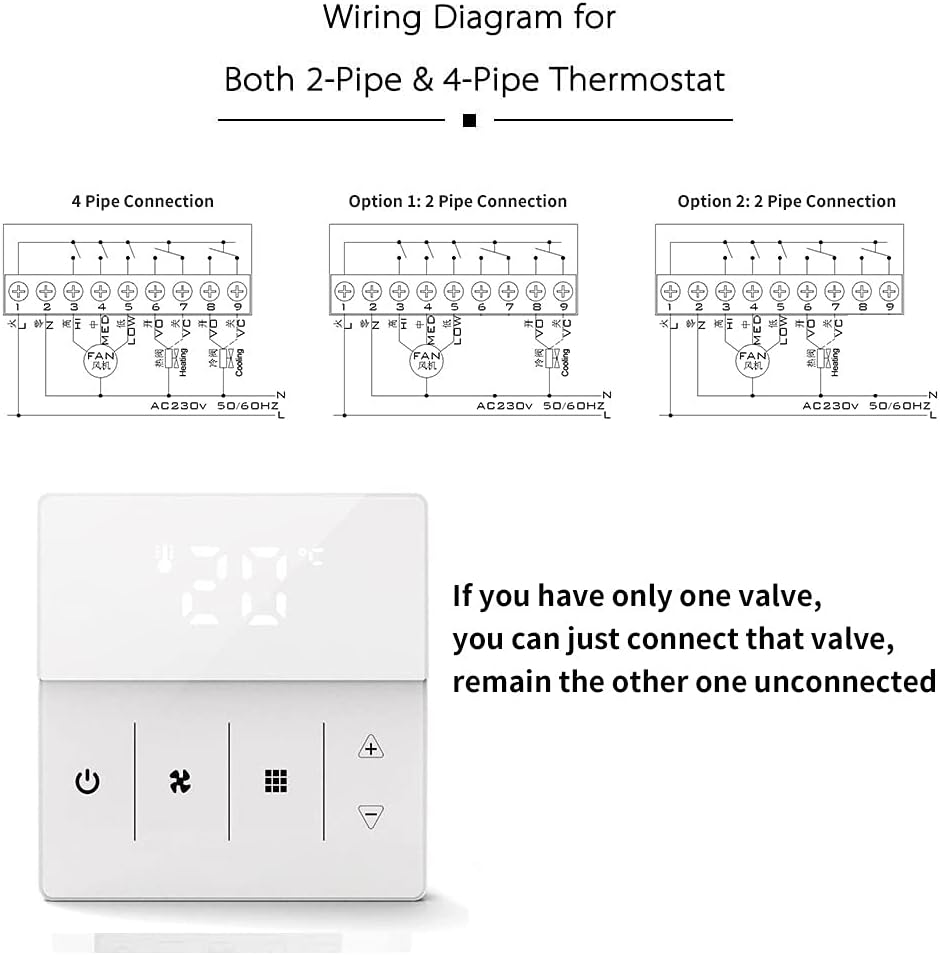 【Pantalla táctil LCD】 Aspecto elegante, pantalla LCD, teclas táctiles, fácil de leer. Este termostato wifi se utiliza para aire acondicionado central, unidades fan coil