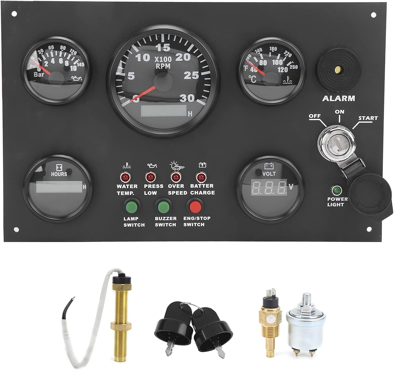 Se entregan dos llaves de contacto, que se pueden utilizar directamente. El panel está equipado con funciones como alarma de temperatura del agua, alarma de baja presión, alarma de exceso de velocidad, alarma de carga de batería, interruptor de luz, interruptor de zumbador y alarma de motor.