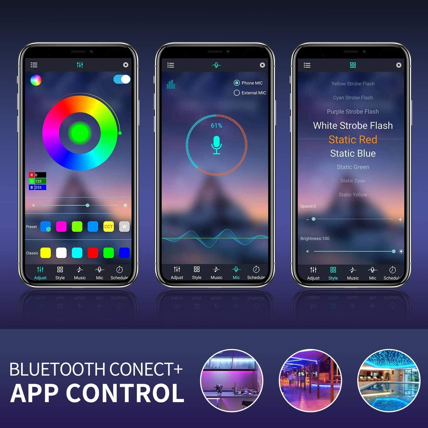 【Modos de música y micrófono】Las tiras LED Bluetooth cuentan con un modo de música inteligente y un micrófono integrado con sensibilidad ajustable que te permite organizar una fiesta romántica con música. El coloration de las luces cambia según el ritmo de la música o el micrófono. Crea un ambiente romántico, hermoso, mágico para tu hogar y fiesta.