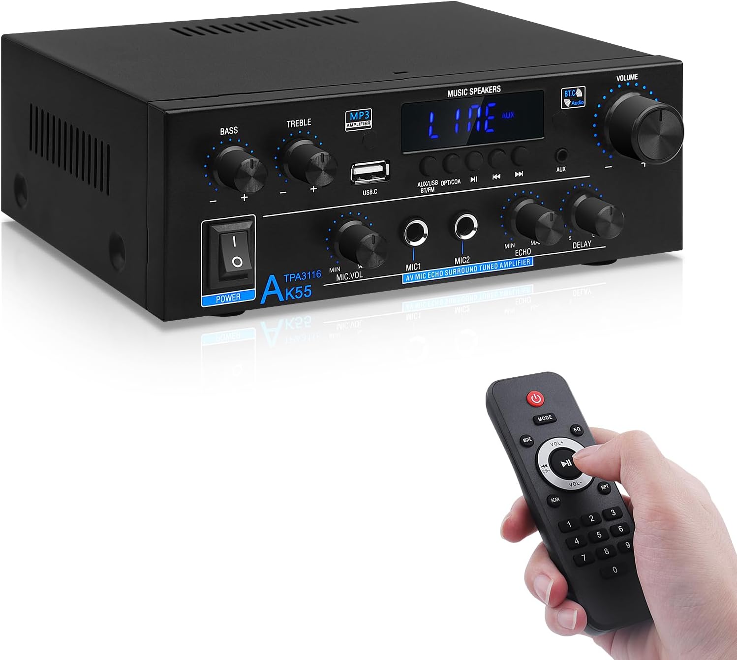 ⏸ Versión de actualización del amplificador de audio digital AK-55▶ Completamente rediseñado, potencia nominal de 70W+70W, perfectamente adecuado para altavoces pasivos de 6,5-10 pulgadas. Actualización de características, funciones Mic, Echo & Reverb Delay añadidas. Con placa de alimentación incorporada suitable con fuente de alimentación AC 110-240V y fuente de alimentación DC 12V/5A, lista para usar.