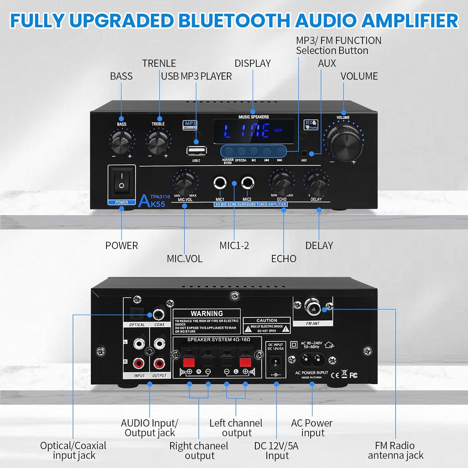 ⏸ Versión de actualización del amplificador de audio digital AK-55▶ Completamente rediseñado, potencia nominal de 70W+70W, perfectamente adecuado para altavoces pasivos de 6,5-10 pulgadas. Actualización de características, funciones Mic, Echo & Reverb Delay añadidas. Con placa de alimentación incorporada suitable con fuente de alimentación AC 110-240V y fuente de alimentación DC 12V/5A, lista para usar.
