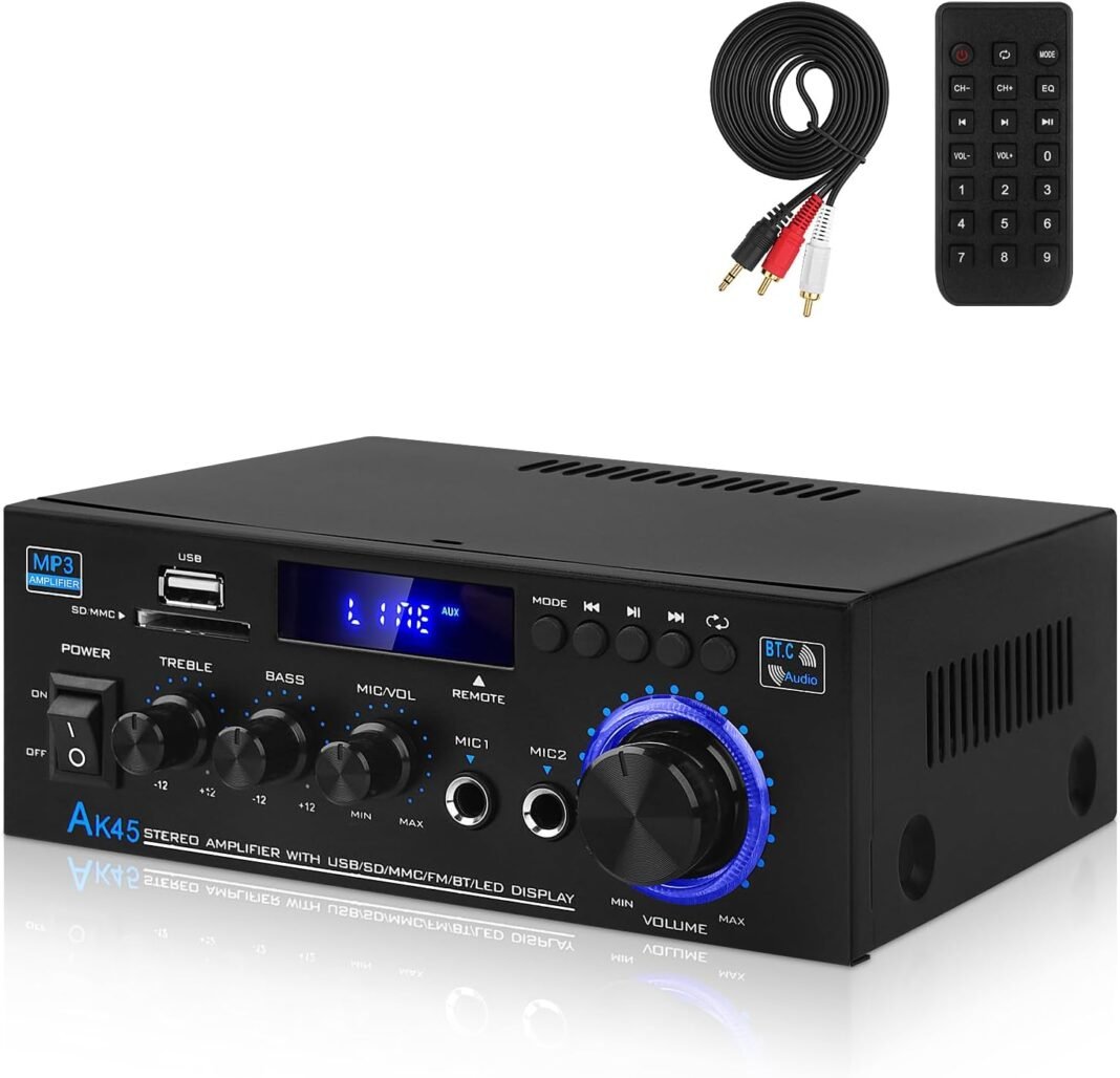 -Amplificador hifi para altavoces domésticos: ESTE Amplificador Hifi AK-45 Con 40 W + 40 W de Potencia Nominal, 2.0 Canales, SE Adapta A Altavoces Pasivos de 4 A 8 Pulgadas 4-16 Ω, Salida Estéreo. Función Ampliada, Con Triples y Graves, Añadiendo Mic Jack y Mic Vol. AK-45 Con Potente Chip de Procesamiento de Audio, Tasa de Distorsión ≤ 0,4%, Fuerte Capacidad antiinterferente, Inductia de Potencia de Kindaje, Excelente Efecto de Sonido, Best para AltaVoces Domésticos.
