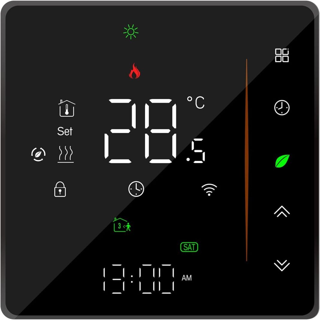 TERMOSTATO INTELIGENTE WIFI: este termostato inteligente WiFi con pantalla LCD presenta una carcasa ultrafina montada en la pared y un diseño de botones táctiles que es fácil de instalar y operar. Suitable con cartuchos cuadrados estándar de 86 mm y cartuchos europeos de 60 mm.