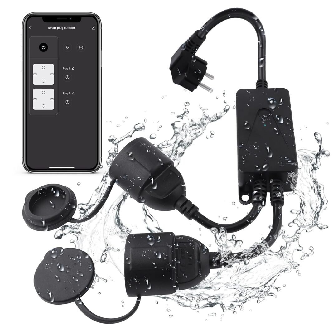 Doble enchufe: antela enchufe Inteligente al aire libre está equipado con dos tomas de corriente, puede utilizar dos aparatos eléctricos al Mismo tiempo, con un ángulo más versatile. Proporciona Comodidad para su vida