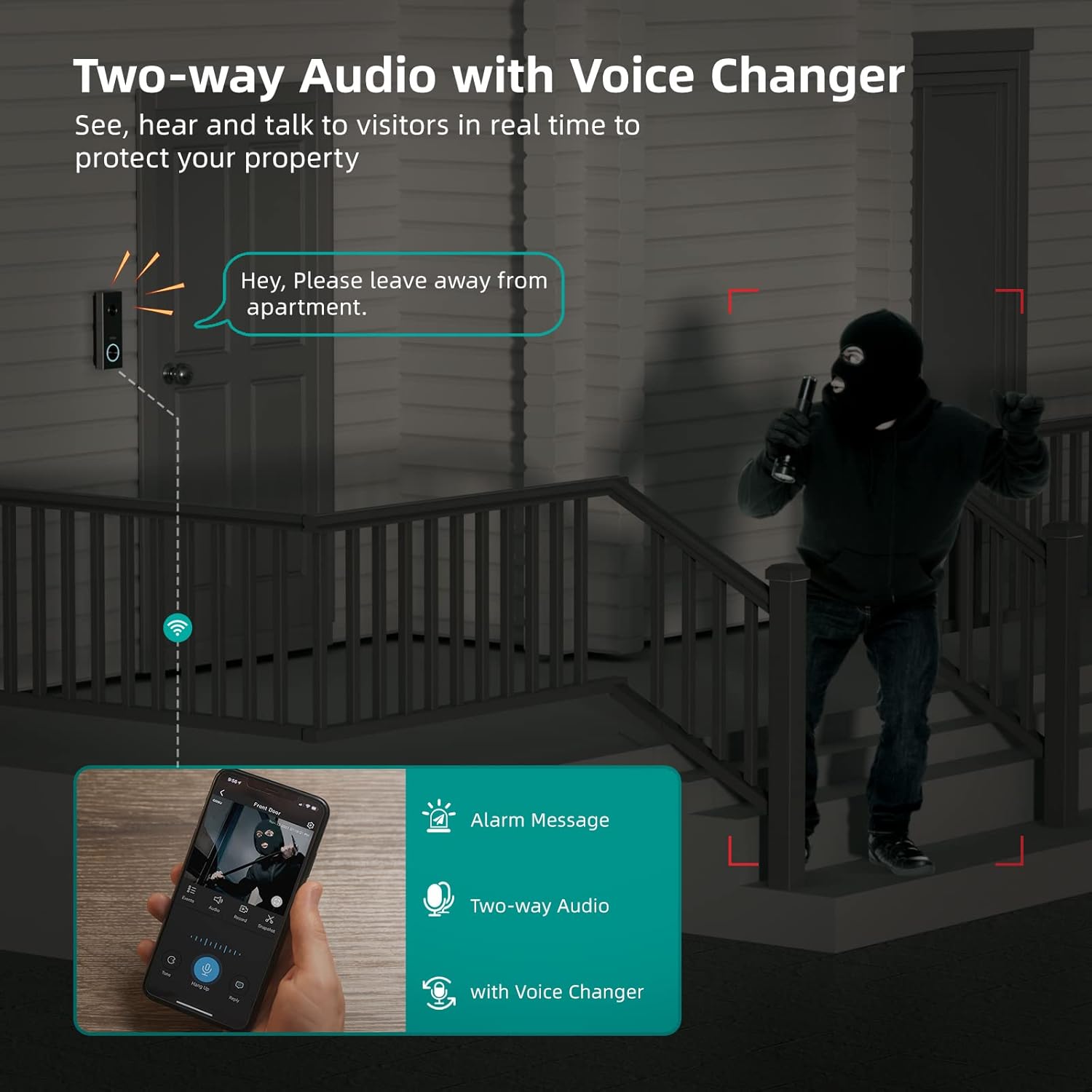 (Funciona con Alexa / Cambiador de voz): Empareje la cámara del timbre aosu con un dispositivo suitable con Alexa para habilitar la vista en vivo y hacer que su vida sea más conveniente y mejor. Puede elegir el sonido del tío y el sonido del payaso para comunicarse con el visitante frente a la puerta.