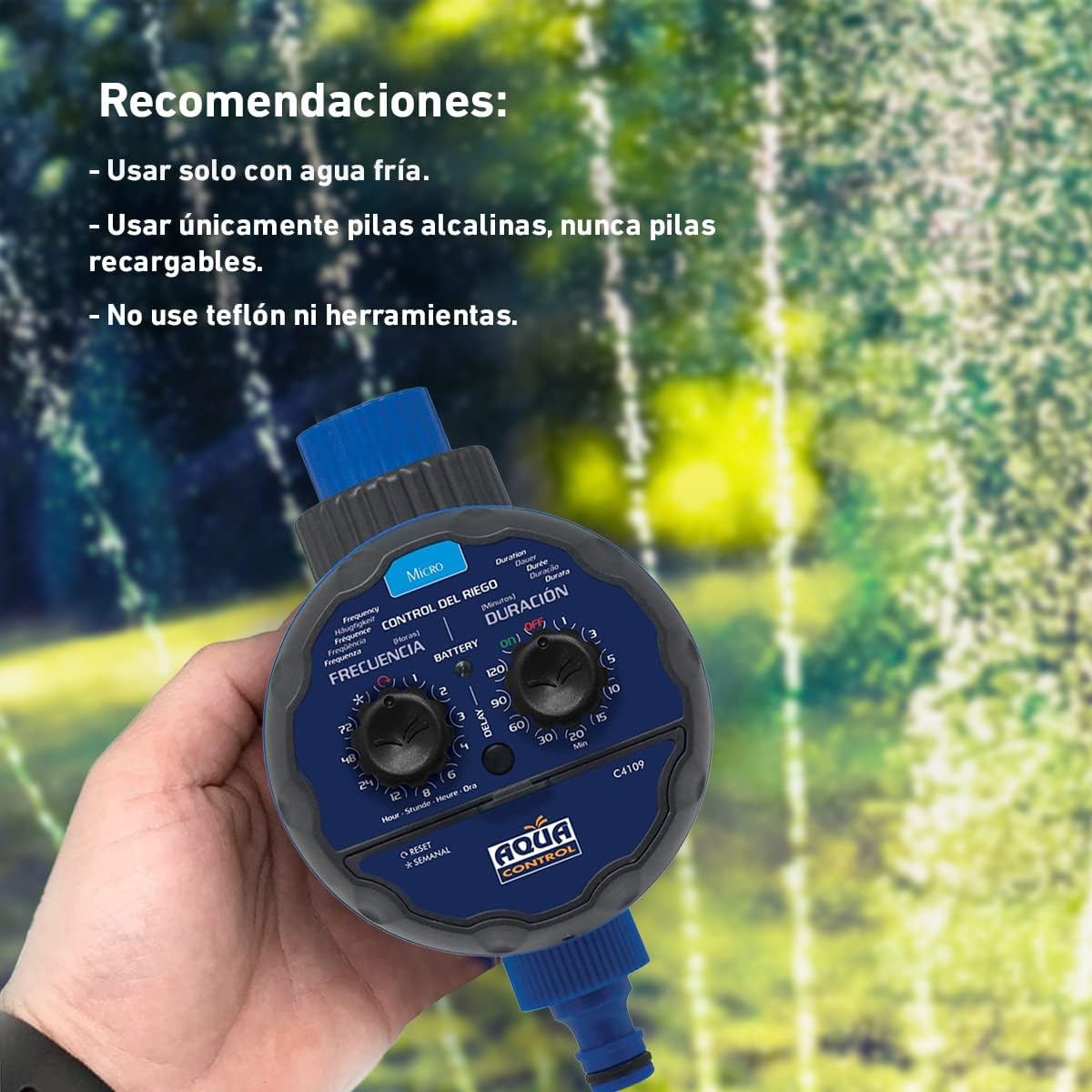 Programador de riego automático para jardines con mecanismo interno de bola que incluye adaptador a grifo rosca hembra de 3/4”. easy pero efectivo