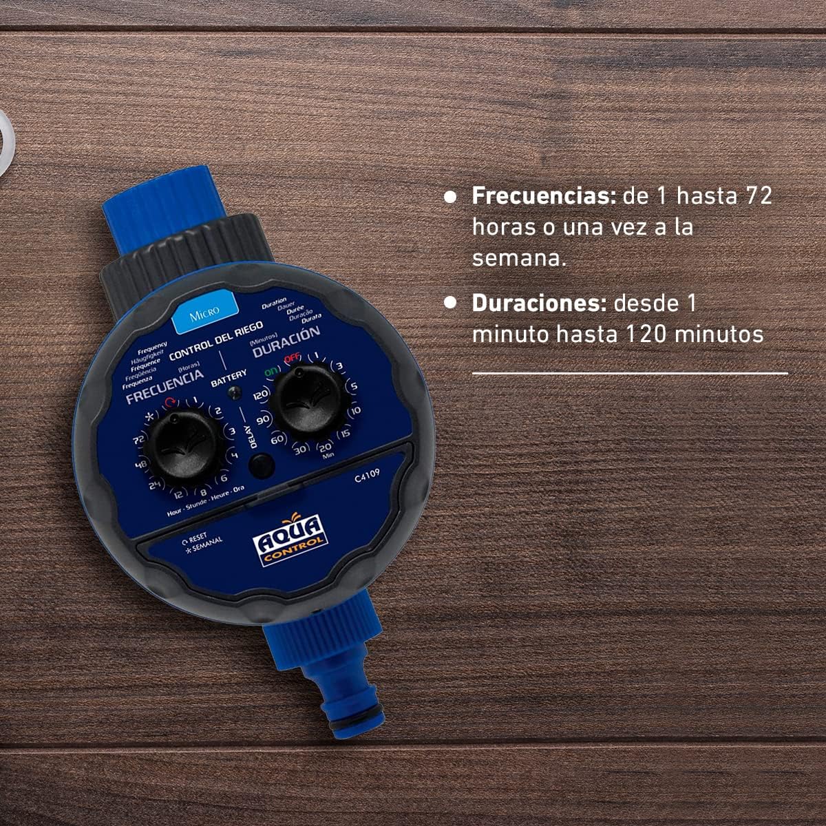 Automatiza el riego con la frecuencia y duración que quieras. Frecuencias: de 1 a 72 horas o una vez a la semana. Duraciones: desde 1 minuto hasta 120 minutos