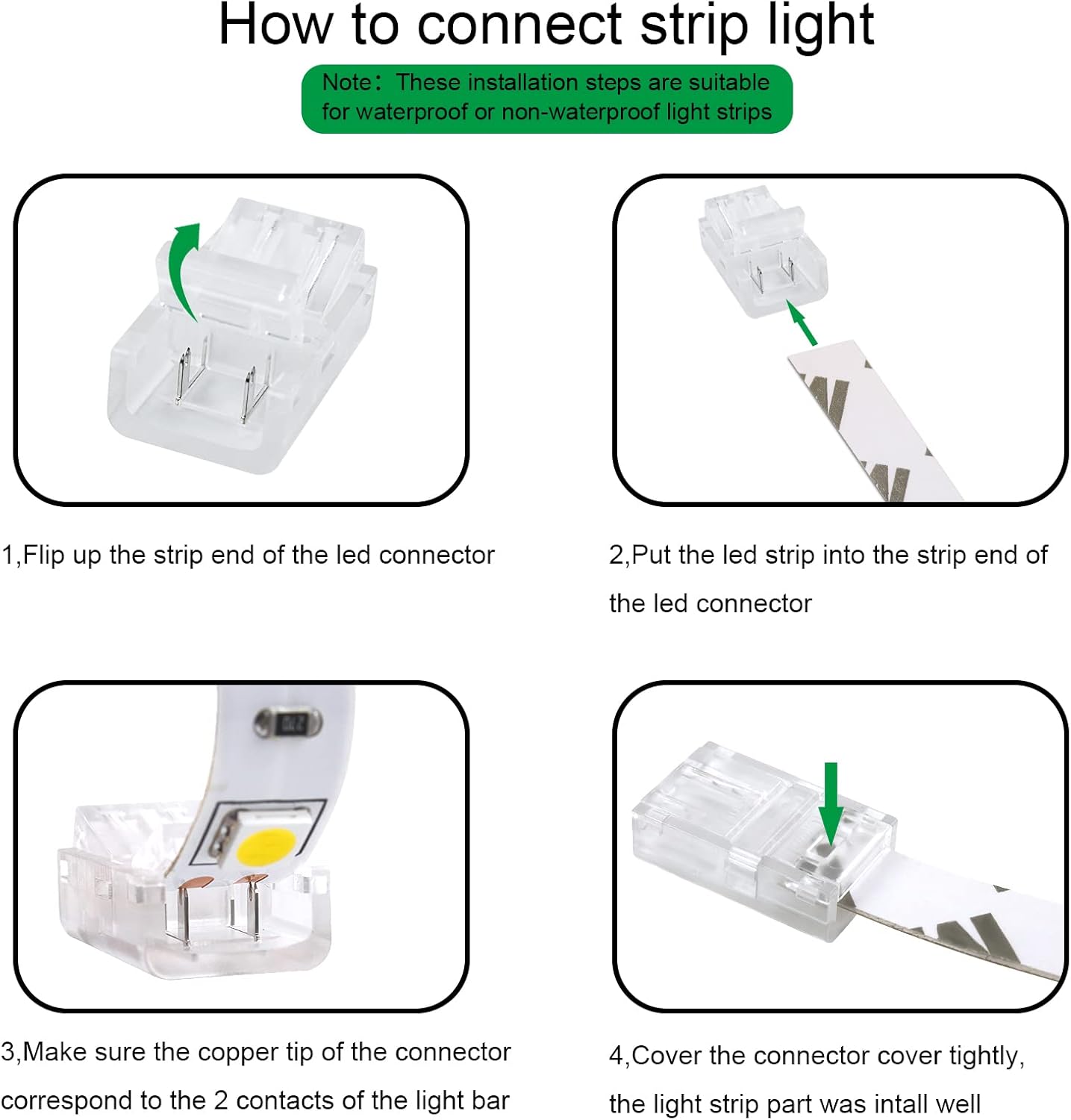 【Aplicación】 Estos conectores de 2 pines son adecuados para conectar tiras de LED de un solo colour 3528/2835 impermeables y no impermeables de 10 mm de ancho.