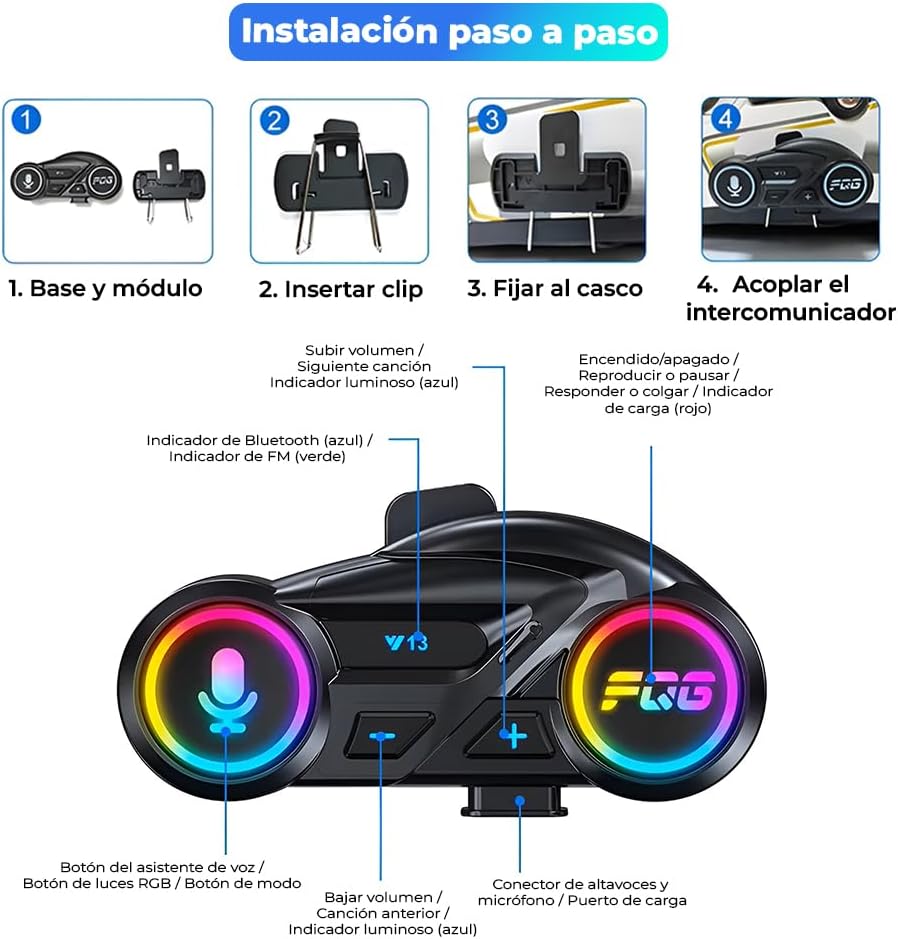 Instalación manos libres sencilla y auténtica. Sin herramientas: conecte la base, coloque los altavoces y el micrófono, emparéjelo y listo. La respuesta automática y el asistente de voz te permiten gestionar llamadas, música y rutas en modo manos libres para moto, manteniendo la atención en la conducción.