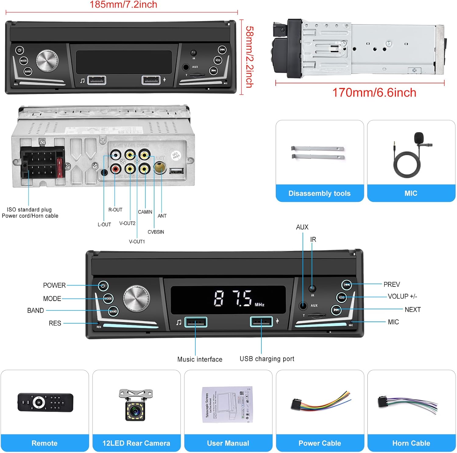 【Estéreo de coche con pantalla táctil de 1 din】La radio del coche tiene una pantalla táctil de alta definición de 7 pulgadas con múltiples botones de moda de colour y diseño de nodo, con una resolución de 1024*600. La unidad principal en el tablero se adapta a varias marcas de automóviles con apertura de doble din, tamaño comúnmente utilizado: 178(L)*101(H)*92(D)mm/7,01(L)*4,01( H)*2,9(D)pulgadas.