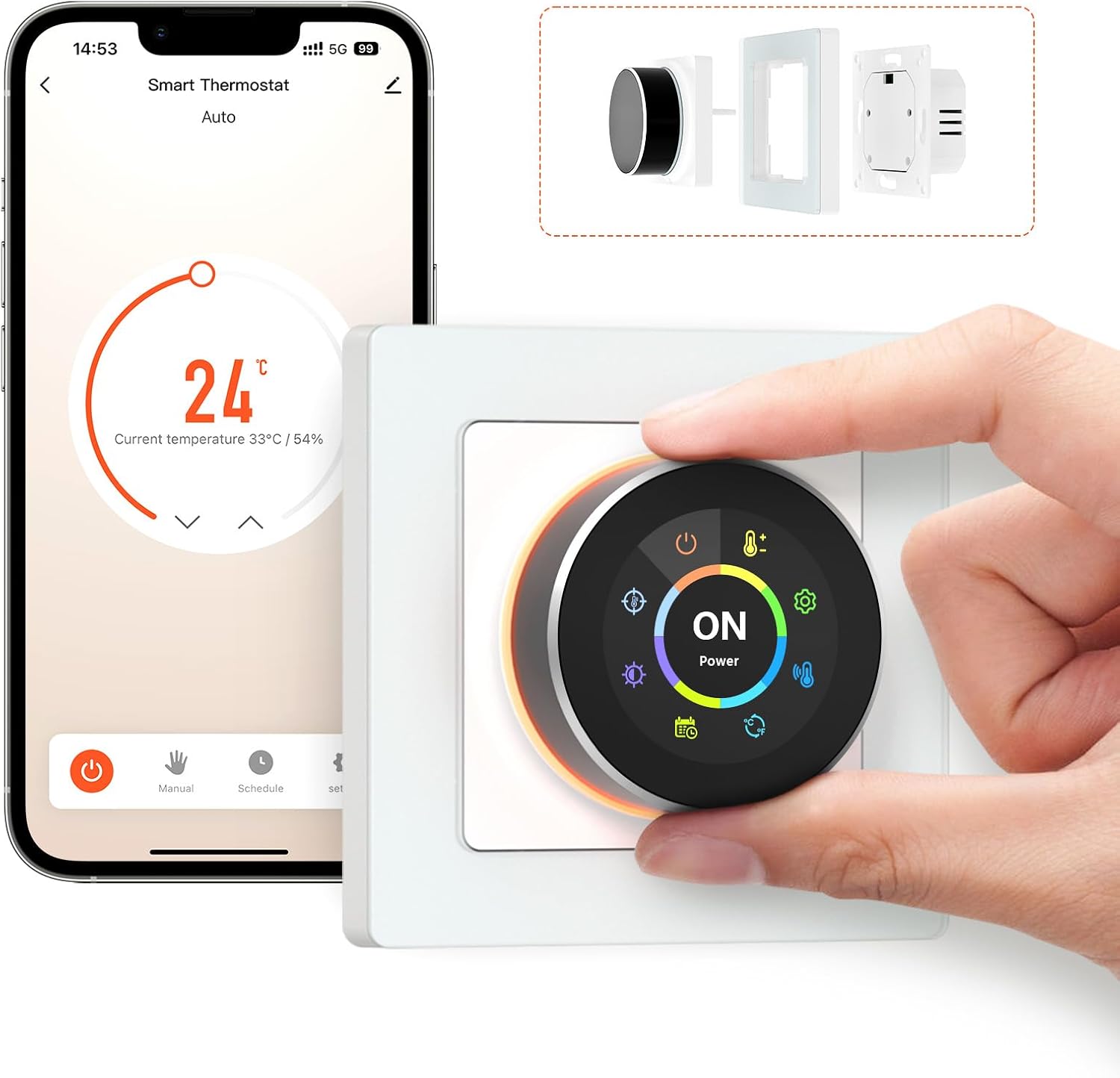 Termostato WiFi inteligente de 55 x 55 mm: Las dimensiones exteriores del termostato son 80 x 80 mm. Las dimensiones interiores son 55 x 55 mm. Adecuado para el sistema 55 y se adapta a múltiples marcos de terraza o para instalación particular person.