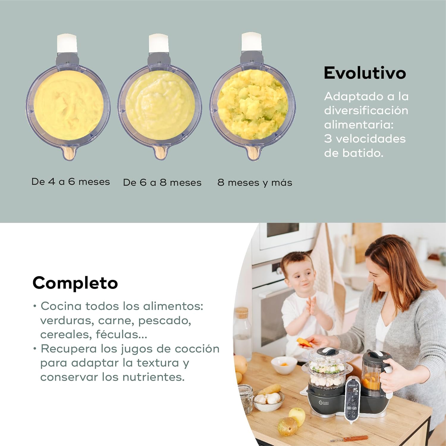 EVOLUTIVO: haz disfrutar a tu bebé con platos adaptados a la diversificación. Con sus 3 velocidades de batido y recuperador de jugo de cocción, ajustarás la textura según la edad de tu bebé