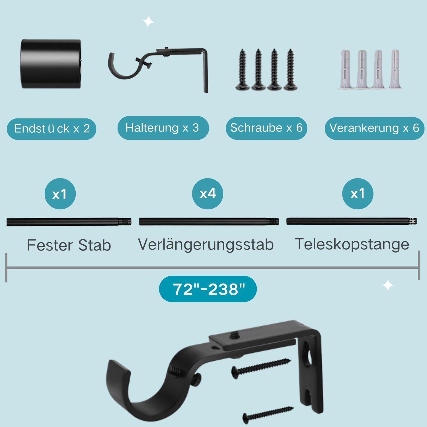 【Contenido del paquete y atención】 1 barra telescópica, 3 barras de extensión y 1 barra de extensión adicional con 2 soportes. Asegúrese de instalar de acuerdo con la segunda imagen y el video de instalación en la galería de fotos de la izquierda.