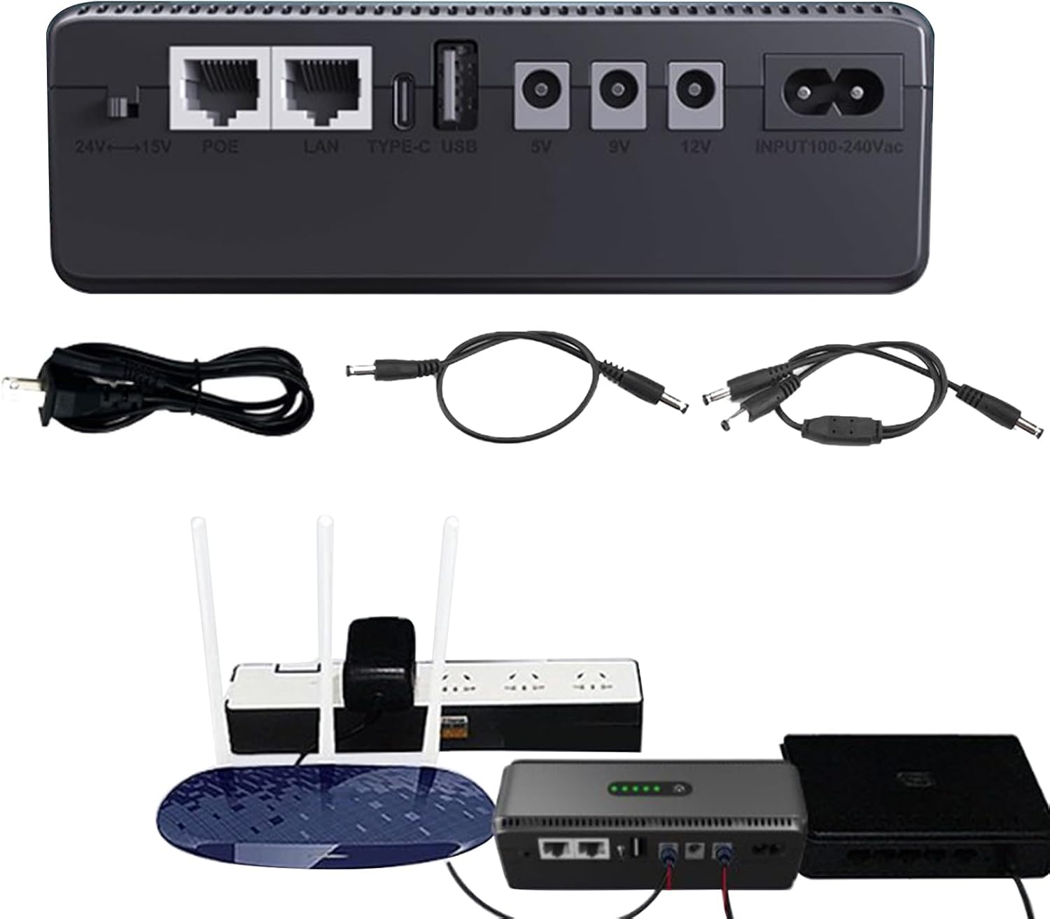 Admite múltiples dispositivos: mantenga sus dispositivos funcionando durante cortes inesperados con este suministro de batería ininterrumpible. Con una batería incorporada de 10400 mAh, puede admitir varios dispositivos simultáneamente, lo que garantiza un suministro ininterrumpido de batería para todos sus dispositivos.