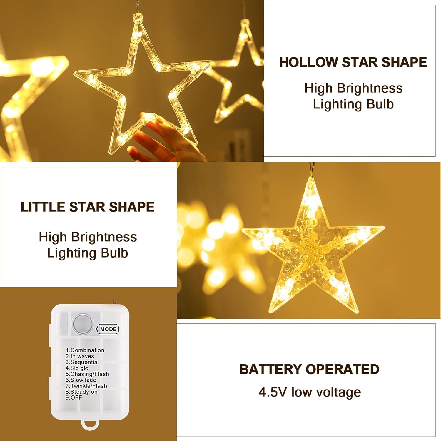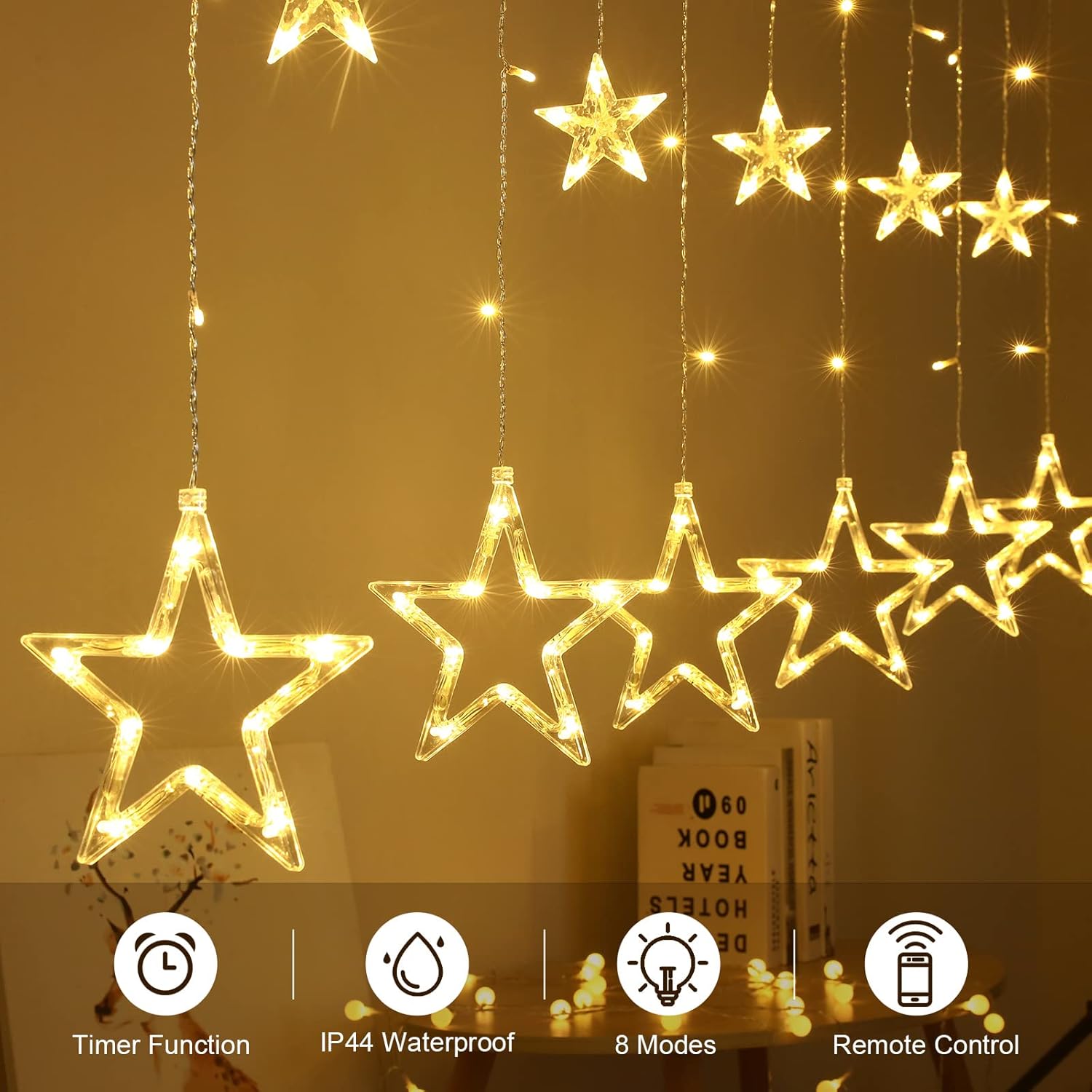 Tamaño: 2m (horizontal) x 1m (largo) Cortina de luz con 12 estrellas y 138 piezas que iluminan la habitación, creando una atmósfera de felicidad en el inside o exterior. La guirnalda ofrece un ángulo de visión de 360 grados y proporciona una luz brillante y encantadora.