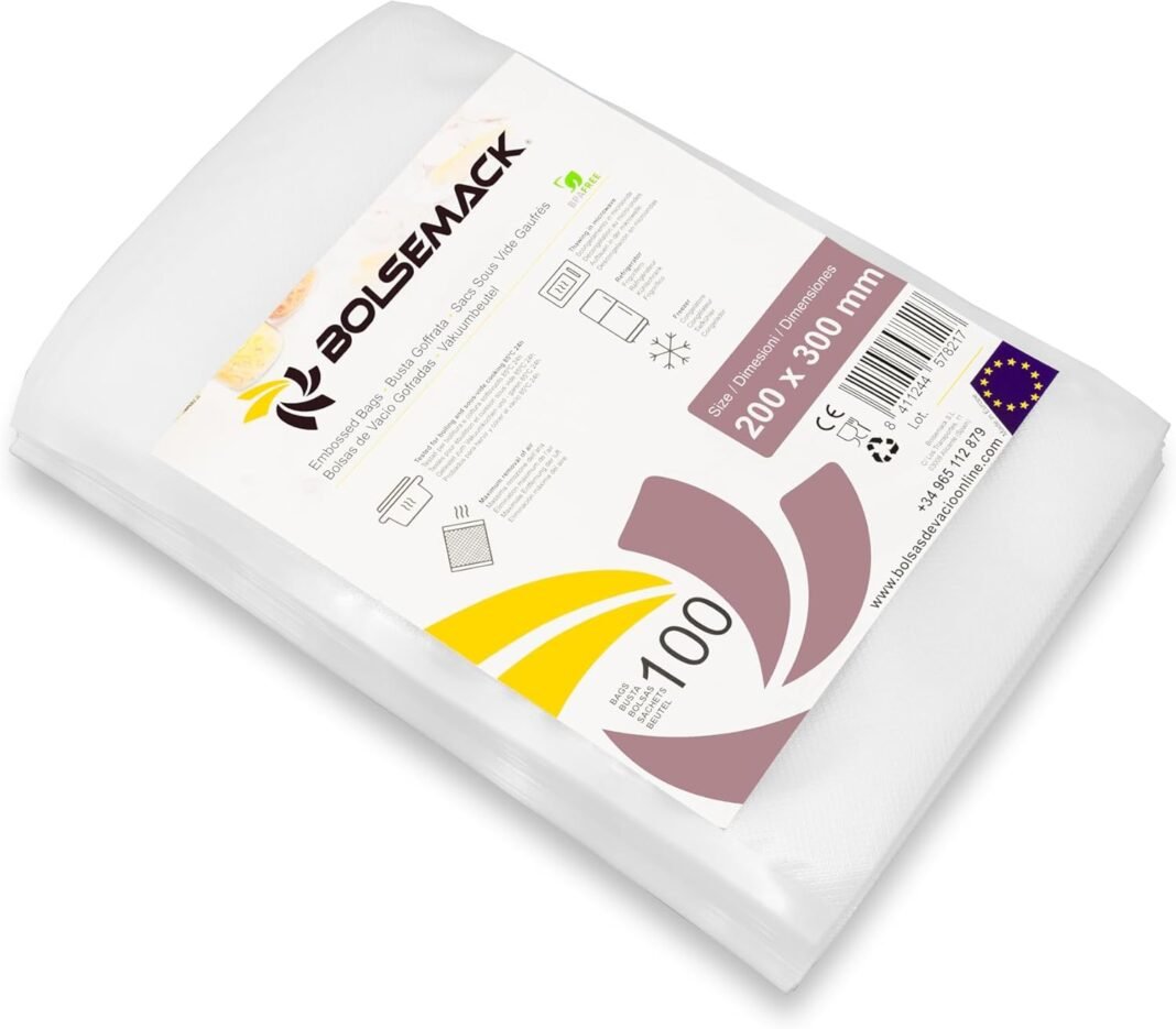 Dimensiones premium: bolsas al vacío 20 x 30 cm, pack de 100 unidades, ideales para conservar embutidos, jamón, carnes (pollo, chuletas, and so on), pescados (salmón, bacalao, and so on), quesos, frutas, verduras, frutos secos, snacks, conservas y platos preparados.