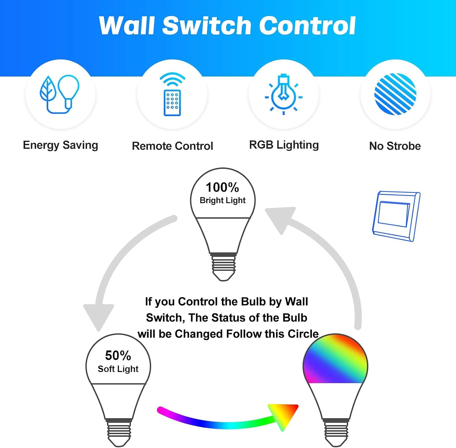 (Bombilla LED RGBW): Las bombillas LED de colores que proporcionan 12 tipos de luces de colores, 4 modos de iluminación (Flash/Strobe/Fade/Easy) y 7 niveles de brillo, puede elegir el coloration que le guste como iluminación ambiental para decorar. su hogar, que puede satisfacer las necesidades diarias de iluminación y también crear un ambiente especial