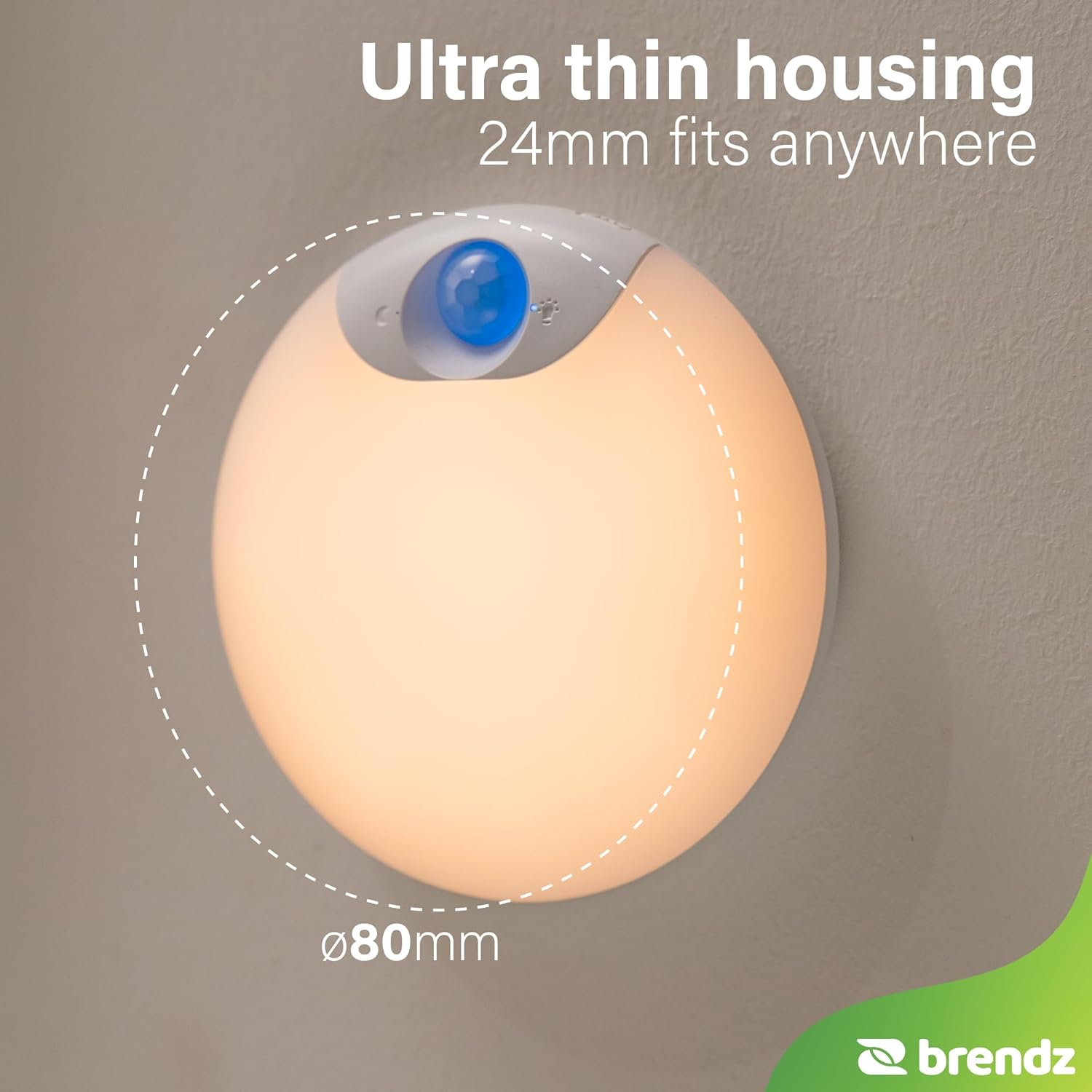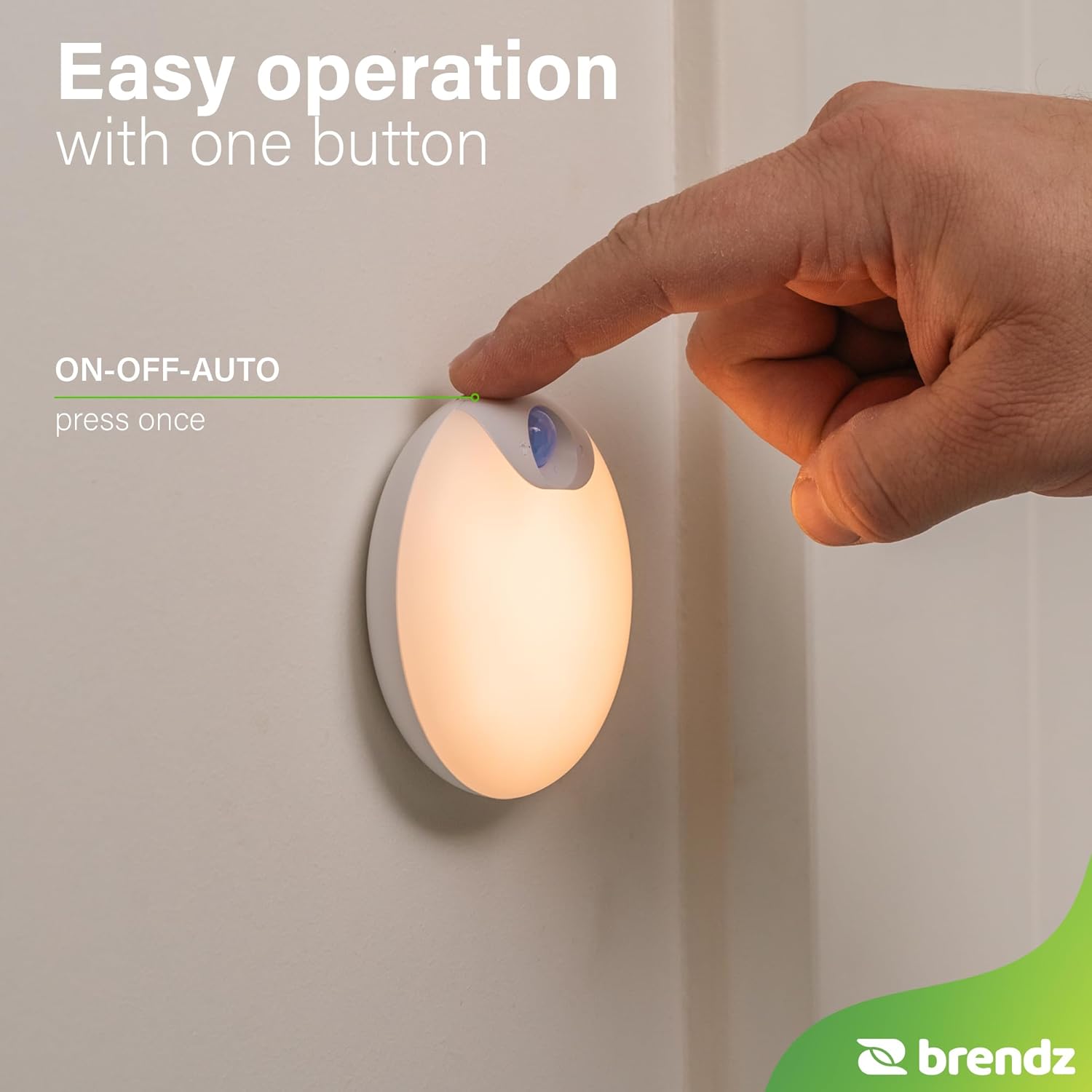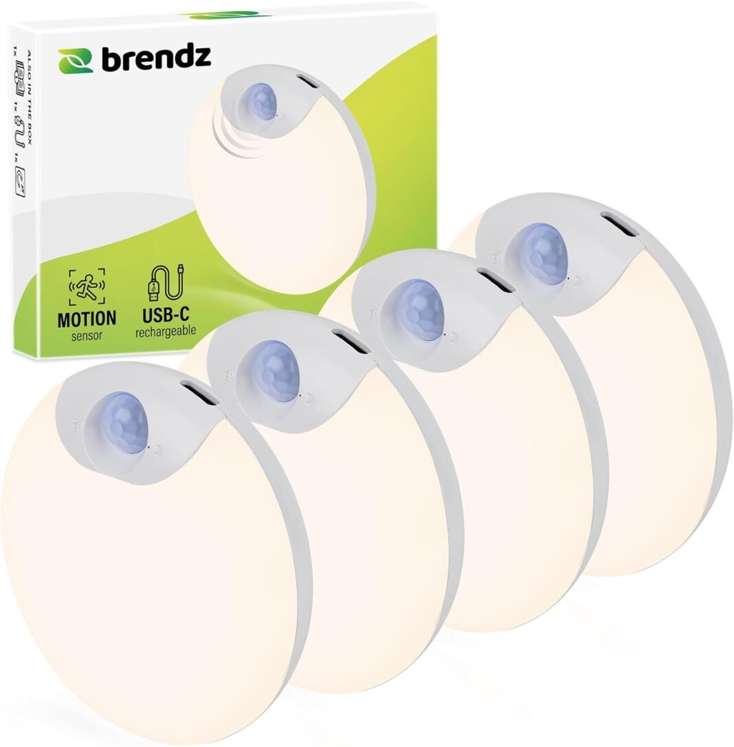 Contenido: 4 piezas de luz LED con sensor de movimiento Brendz Alta, tamaño compacto Ø 80 x 24 mm, peso 53 g, batería de polímero de litio incorporada de 600 mAh, cable USB-C de 50 cm, materials de montaje y handbook.