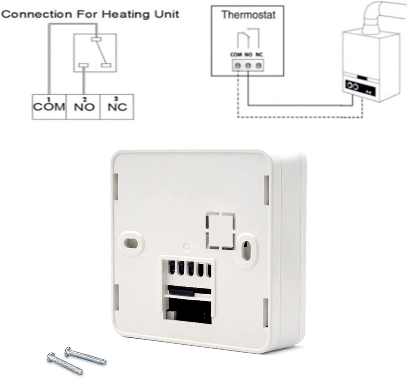 Funciona con calefacción de Fuel, Gasoil, Pellets, and many others…) simplemente conectando los cables a los 2 terminales (COM y NO). Capacidad máxima de corriente 3A.