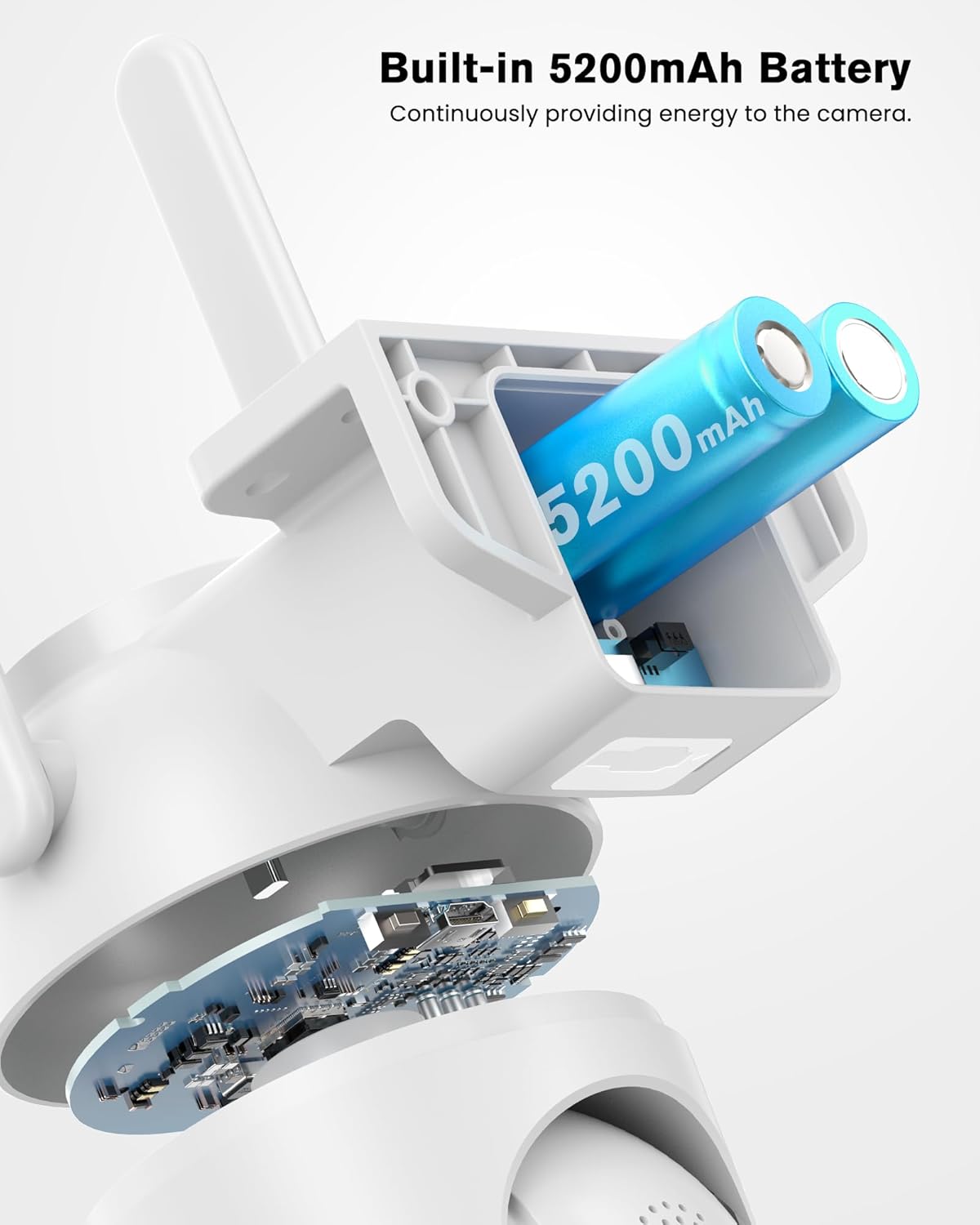【Energía continua de baterías de alta capacidad y paneles solares】Esta cámara 4G WiFi gratuita está equipada con una batería recargable de 5200 mAh y un panel photo voltaic de 5 W, lo que permite un largo tiempo de espera con energía de la batería. Nunca tendrás que preocuparte por quedarte sin energía. Con sólo 4 horas de luz photo voltaic directa al día, el panel photo voltaic puede proporcionar suficiente energía para mantener la cámara funcionando durante todo el día.