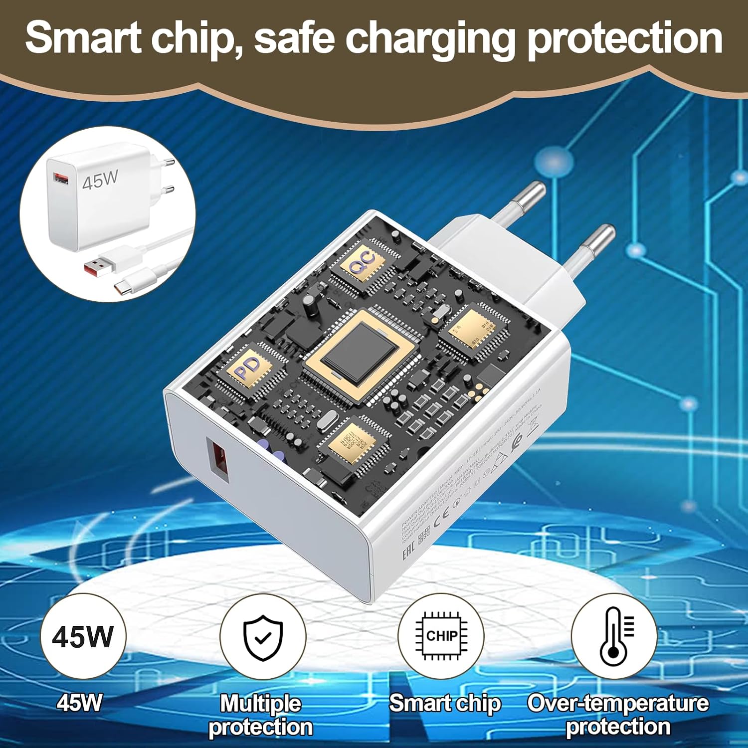 【Cargador 45W】Fabricado con materials ignífugo y resistente a altas temperaturas, identifica y previene inteligentemente riesgos como sobretensión, sobrecorriente y cortocircuitos, garantizando la seguridad incluso durante la carga nocturna. Su disipación de calor optimizada evita el sobrecalentamiento durante la carga o el juego, protegiendo completamente tus dispositivos electrónicos.