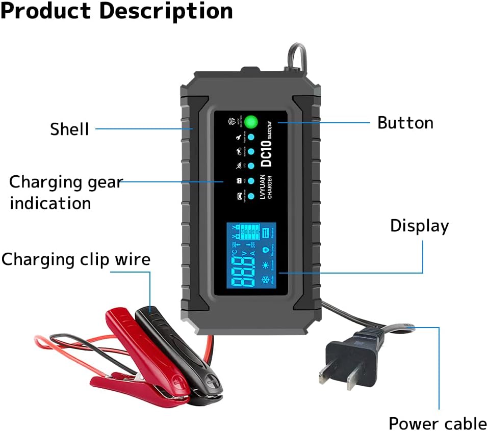 Seguridad: Este cargador de batería de coche de 10A tiene varias funciones de protección como protección contra cortocircuitos, sobrecorriente, sistema de enfriamiento y protección contra polaridad inversa. La función de reparación activa baterías no utilizadas durante mucho tiempo, antiguas o baterías que no se pueden cargar.
