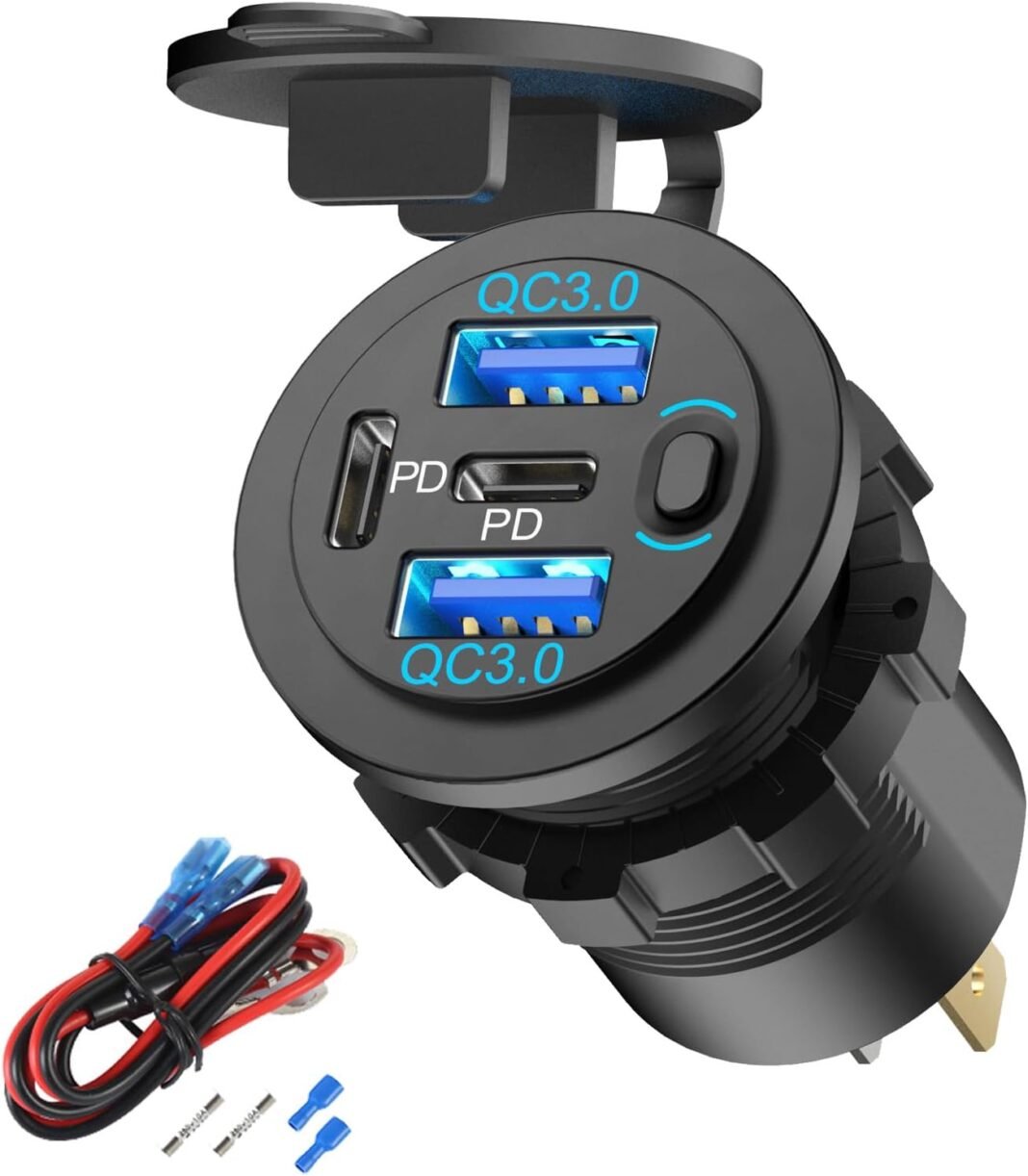 VERSIÓN SÚPER RÁPIDA DE 4 PUERTOS: Nuestra salida USB de 12 V se actualiza a cuatro puertos USB, 2 PD 30 W + 2 QC 18 W, que pueden cargar cuatro dispositivos al mismo tiempo y hasta 78 W de salida. Admite PD2.0, QC2.0/1.0 y todos los demás protocolos, proporcionando la velocidad de carga más rápida para todos los dispositivos.