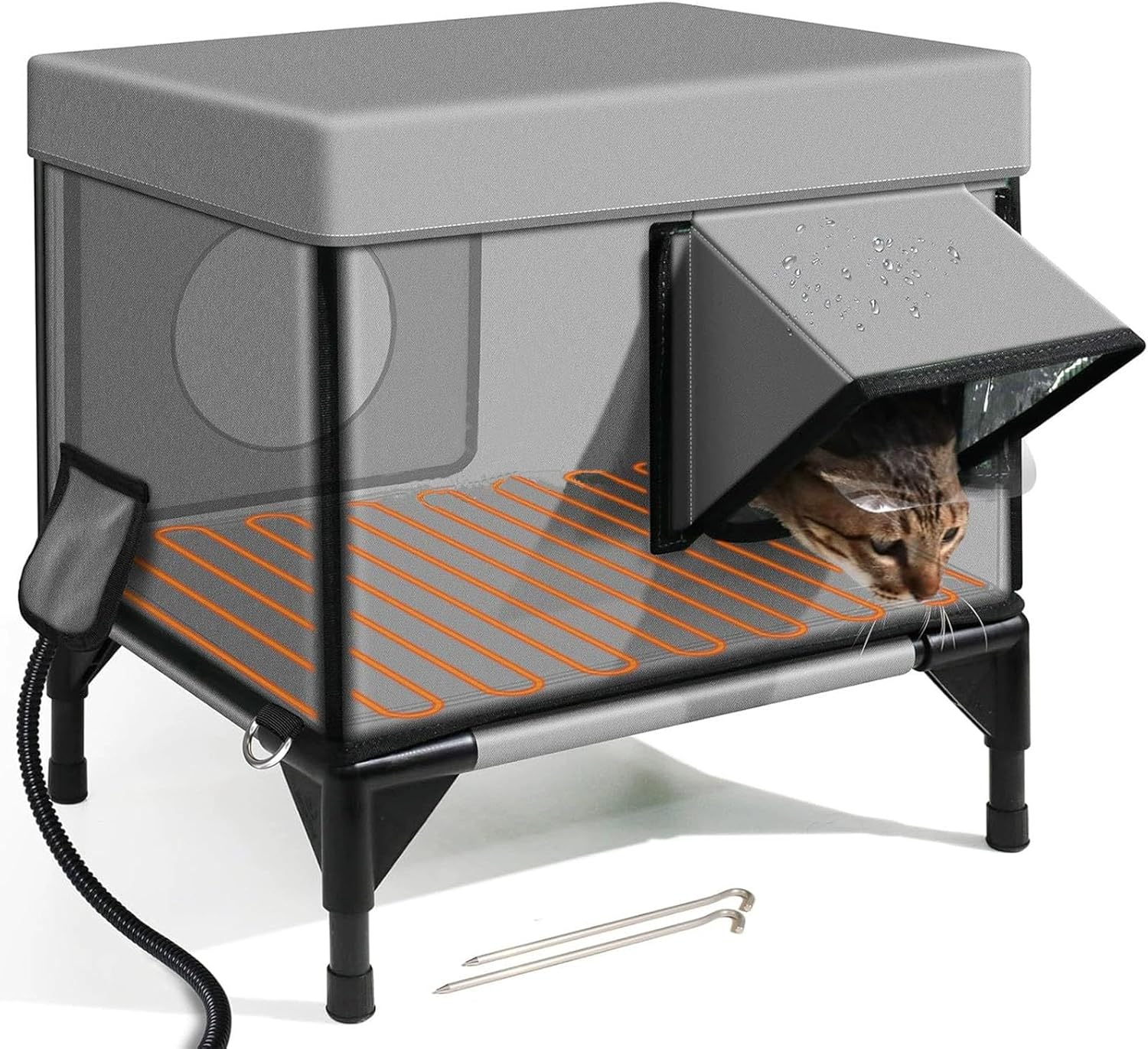 Diseño único: ¡nunca más te preocupes por los elementos! La Casa de Gatos con Calefacción al Aire Libre Cuenta Con Un Tello de Oxford Totalmento impermeable Mejorado que evita que la lluvia Ingrese. Además, su base elevada de 13 cm asegura que sus mascotas al aire libre se mantengan seguras y secas, incluso en los días más lluviosos o nevados.