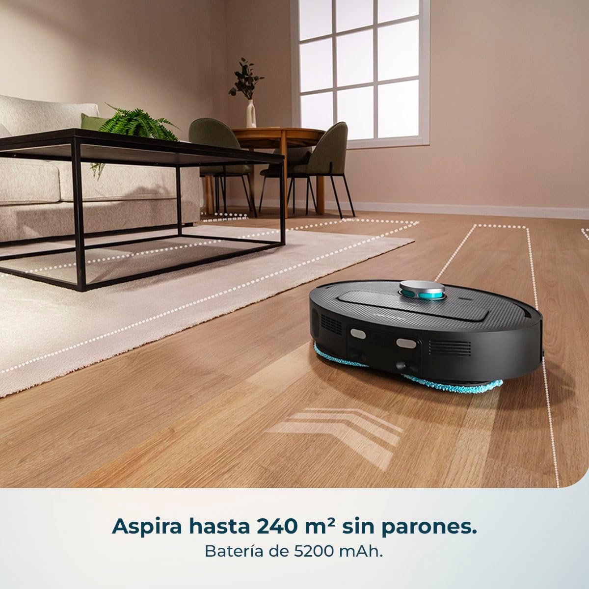Autonomía ampliada y limpieza personalizada con la app: Con hasta 240 minutos de autonomía en modo ECO y capacidad de cubrir hasta 240 m², controla el robotic desde la app, outline modos de limpieza y asegúrate de no quedarte nunca a medias con tu sistema Whole Floor 3.0.