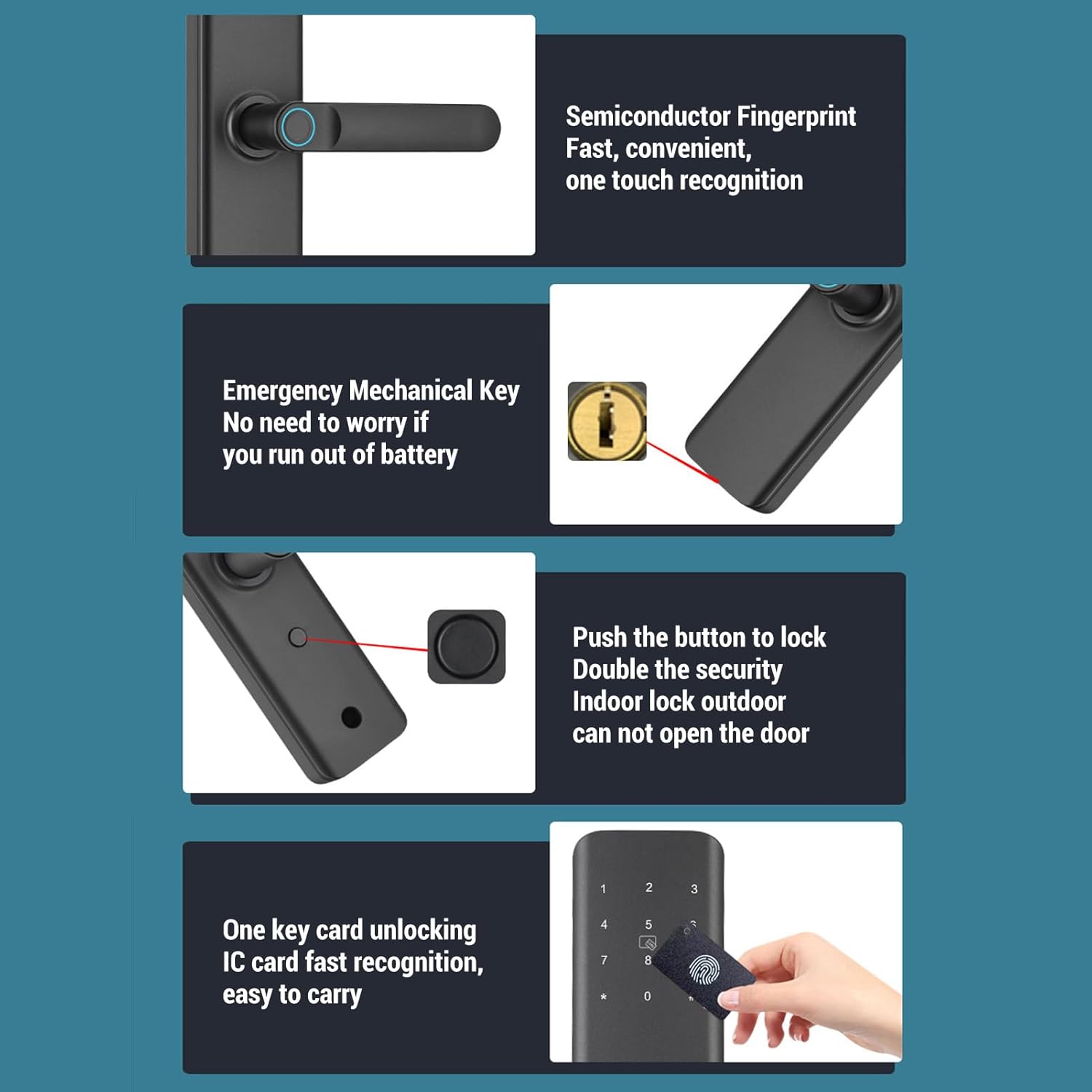 (Reconocimiento avanzado de huellas dactilares) Nuestra cerradura de puerta inteligente utiliza un sensor de huellas dactilares semiconductor, que proporciona una identificación rápida, precisa y segura. Con un chip de IA, ofrece capacidades de autoaprendizaje, logrando reconocimiento de nivel financiero, alta sensibilidad y precisión, lo que lo hace excellent para varias puertas de entrada, incluidas casas residenciales, oficinas y apartamentos.