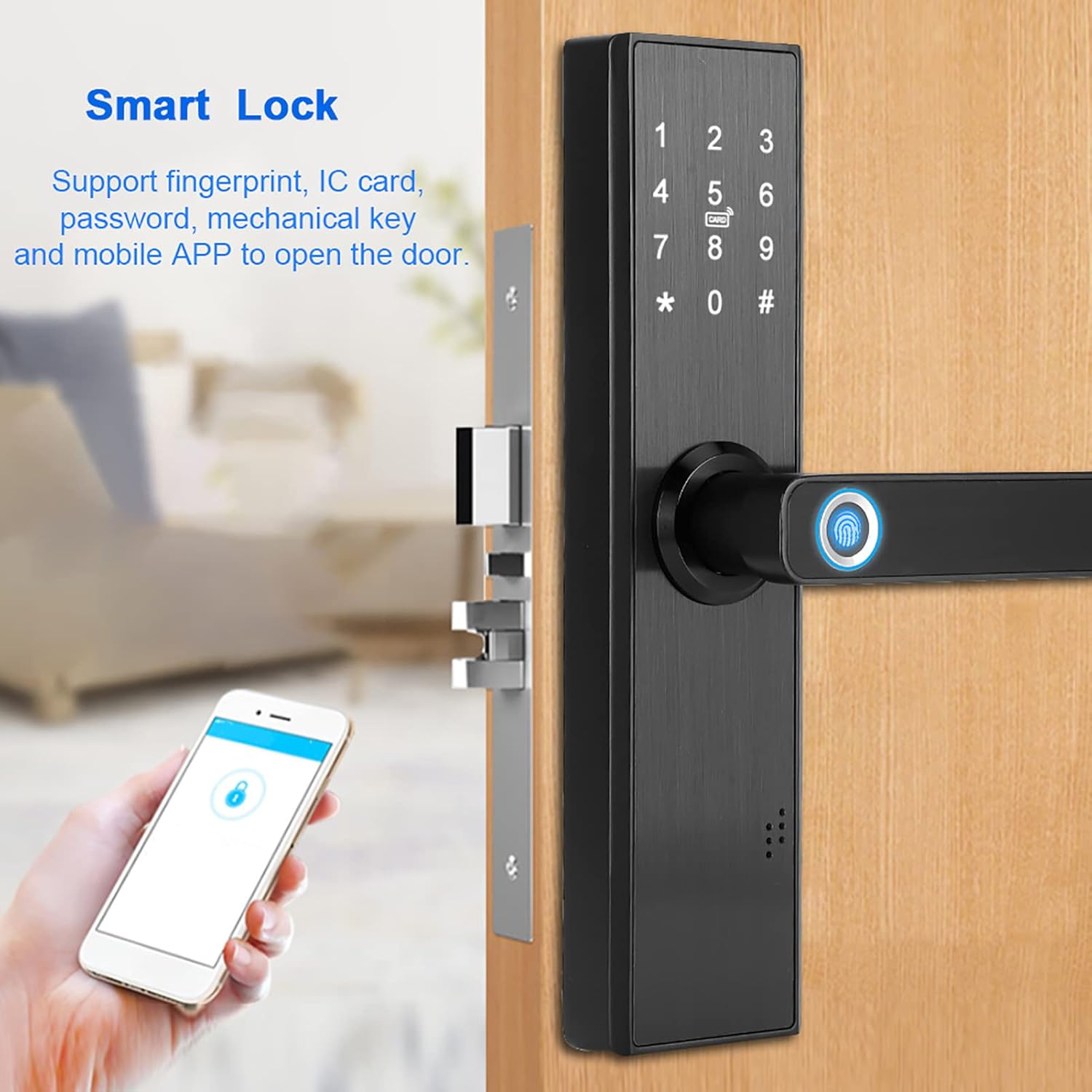 【5 Métodos de Desbloqueo】 la Cerrado Electrónica Inteligente Wifi Admite una variedad de Métodos de apertura de puertas, incluidas huelellas dactilares, Tarjetas IC, Contraseñas, Llaves mecánicas y APLICACONES MOCVILES. También Puedes ver El Historial de Desbloqueo A Través de la Aplicacia para Comprender El Uso de la Cerrado de la Puerta de Manera Oportuna.