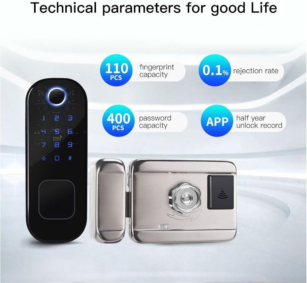 Integración de aplicación inteligente: gestiona la seguridad de tu hogar sin esfuerzo a través de la aplicación, lo que te permite enviar códigos de acceso temporales y recibir notificaciones en tiempo actual sobre el estado de la puerta y alertas de seguridad.