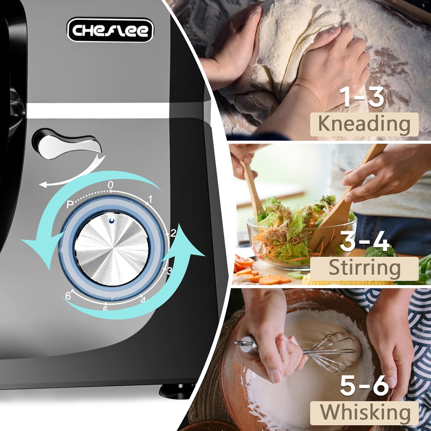 【Batidora versátil】 CHeflee SM-1507 utiliza el diseño del botón de liberación del cabezal, se puede cambiar manualmente y súper rápido desde los ganchos, el batidor y el agitador. Definitivamente es el accesorio de cocina perfecto para glaseados, merengues, aderezos cremosos, masas, productos horneados y más.