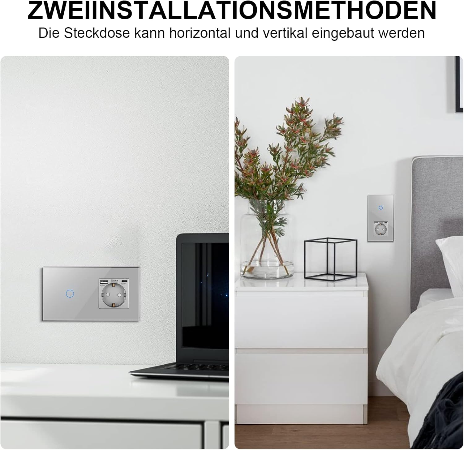 Composición: Interruptor de luz táctil inteligente (se necesita cable neutro) y enchufe Schuko (no inteligente) con puerto tipo C y puerto tipo A (máx. 3,1 A)