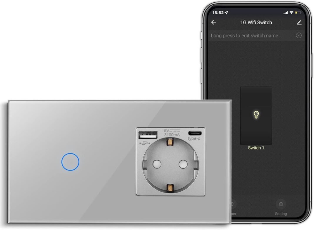 Composición: Interruptor de luz táctil inteligente (se necesita cable neutro) y enchufe Schuko (no inteligente) con puerto tipo C y puerto tipo A (máx. 3,1 A)